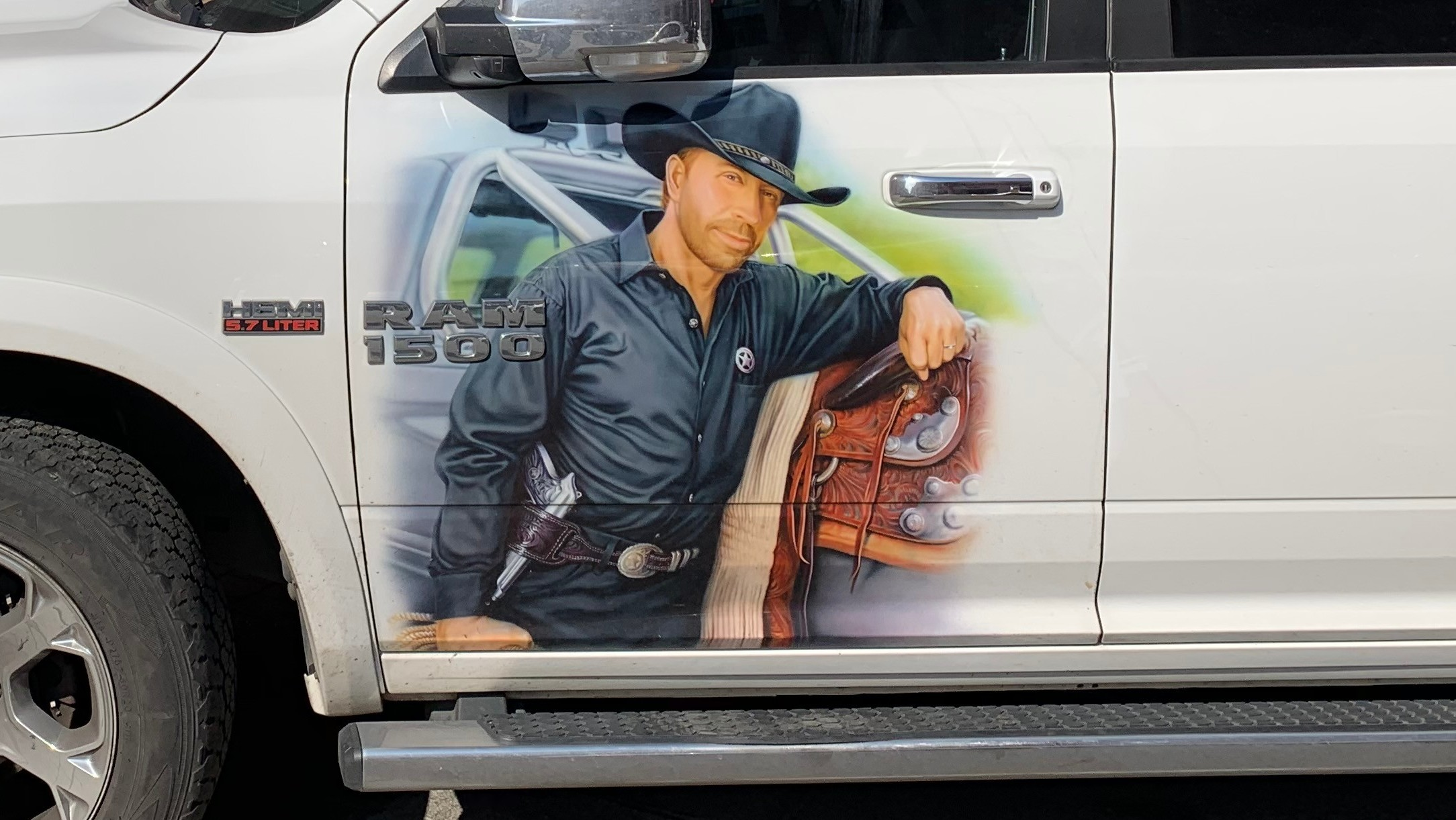 You turn the corner and soon come across a full-size Dodge Ram pickup, parked at an angle. On its driver's-side door, you see a mural of Chuck Norris leaning on a saddle. And that saddle is saddled on the bed of a different pickup truck.