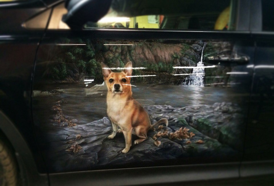 The short answer is: yes. Marina describes her services as "premium class." This means that, in the public eye, airbrushed artwork on a car is "considered very expensive." So, besides helping to prevent car theft, that Chihuahua is a not-so-subtle: wink, wink, I've got dough to spend on my paint job.