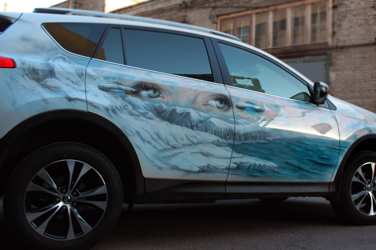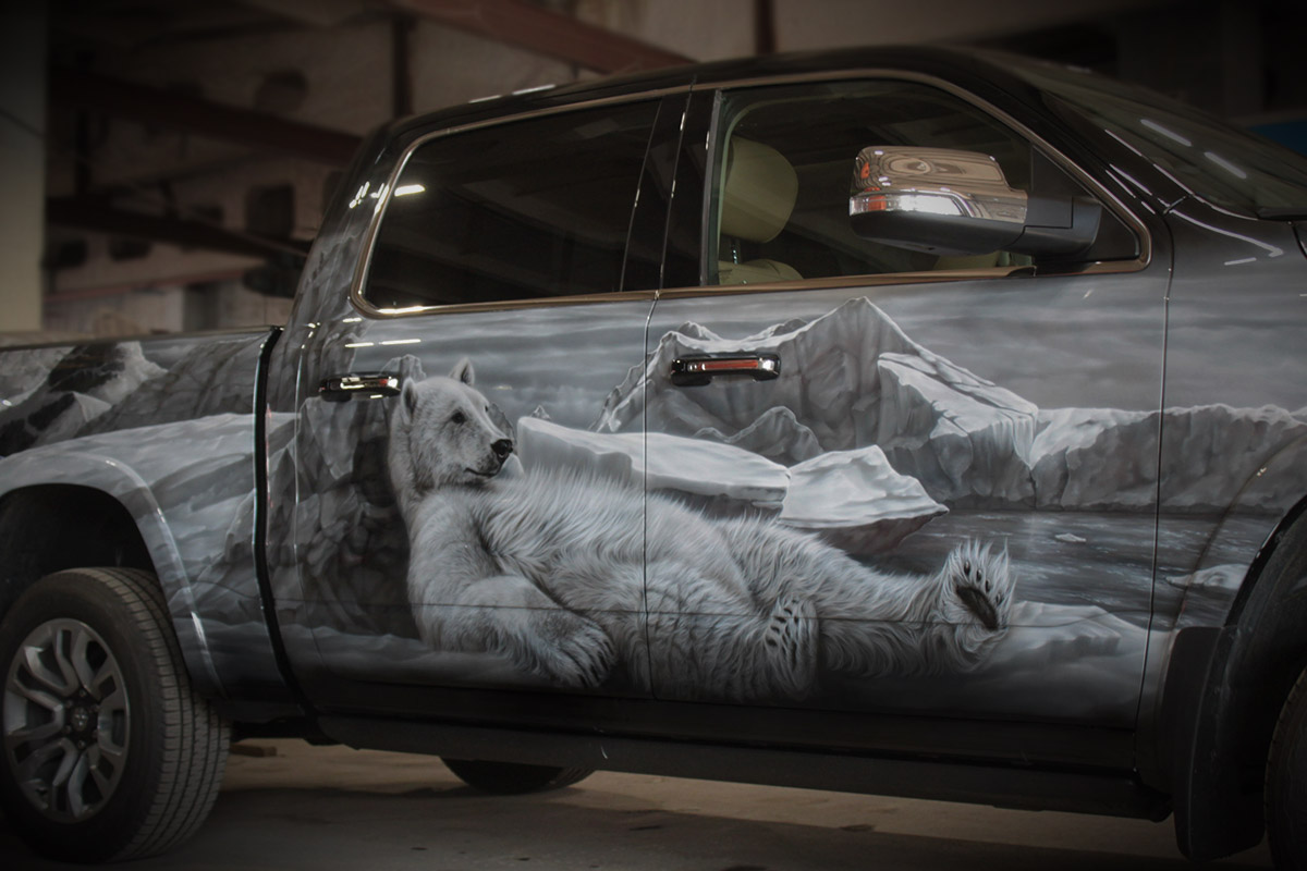 The portrait, no larger than a coffee table, would take Marina days to complete. Far more often, Marina works on a much larger type of canvas—a Honda CR-V, for instance.