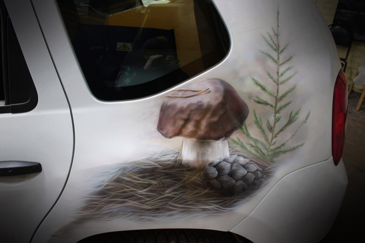 The more popular themes, like big cats and angry looking bears, are somewhat expected. They're mean looking. They're the airbrushed equivalent of angry headlights on a Jeep. But there's something genuinely incredible about waking up one morning, and saying to yourself: "That's it. I'm getting these mushrooms permanently sprayed directly onto my Renault Duster. MUSHROOMS THAT I PICKED MYSELF MOTHERFUCKERS!"