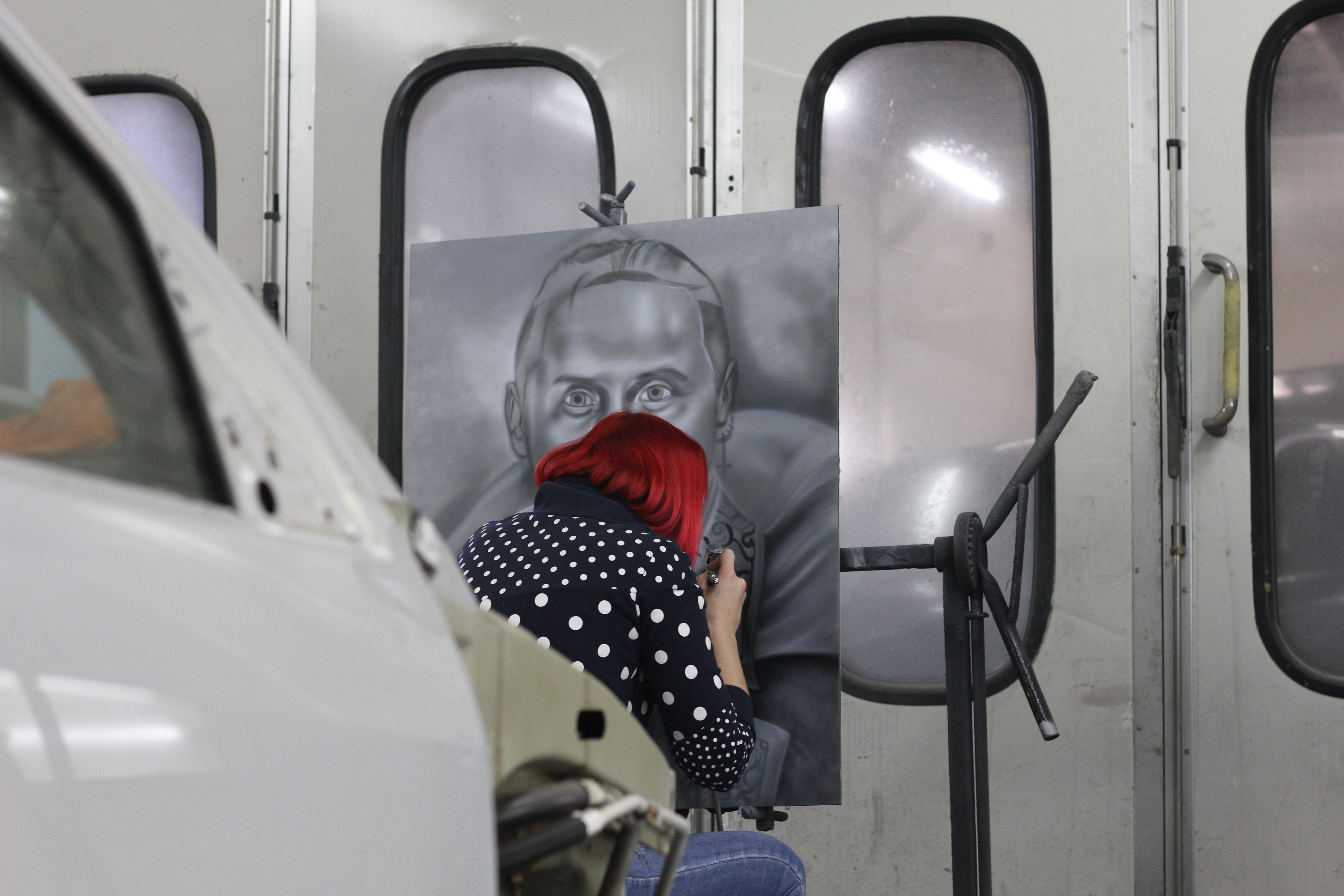 I'm at an automotive repair shop on the eastern outskirts of St. Petersburg. There's an assortment of BMWs strung out on lifts. A few guys in dark blue overalls, up to their shoulders in grease, operate on the broken Bavarian machines. At a glance, nothing besides routine wrenching seems to be going on here. But at the edge of the shop, past a pair of swinging doors, I come across a canvas fixed on a metal stand. And behind that canvas sits Marina Oleinikova.