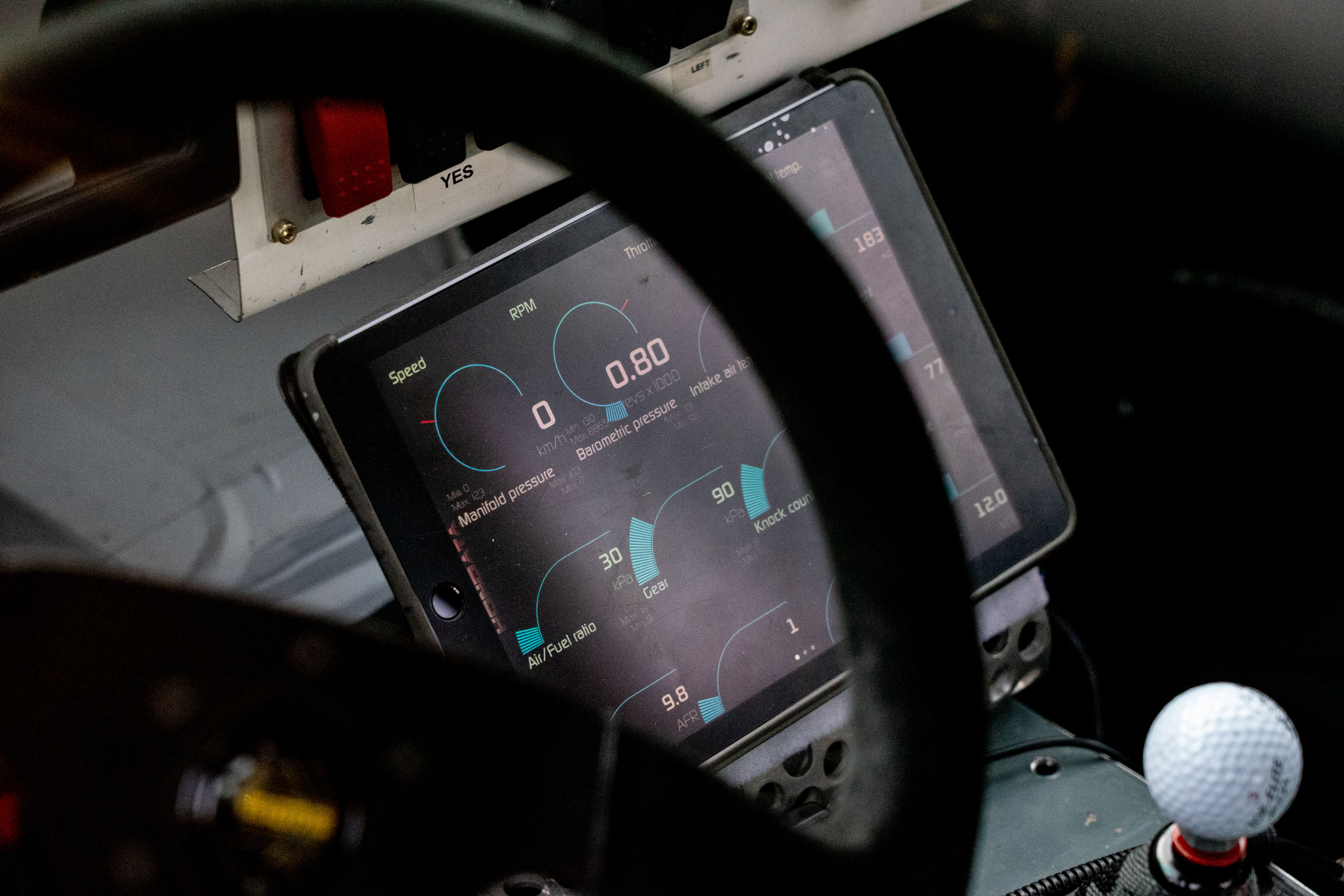 The car as a whole is a blend of trial and error and creative solutions to the problems that come up when doing something no one else has. Some of the parts make sense: The Hilux-sourced rear axle is not uncommon in custom rear-drive builds of Mk. I and Mk. II Escorts. I've seen S2000 motors, this one rebuilt from a warranty core, used to power everything from a 1980s Corolla GT-S to a second-gen Ford Cortina. Here, a few clever tricks were used to tame idle on the Honda quad-throttle-body setup, and a tablet provides instrument feedback. Vawter slots his phone above the wheel to serve as an instrument cluster.