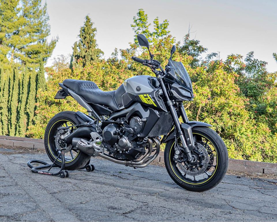 I realize I kind of threw all the bikes together at the end here, and I swear that wasn't an intentional move to bury them. Anyway, this FZ09 is a bit of an enigma. It's a naked bike, usually meant for bopping around on low-speed streets, but it's got a raised windscreen and an aftermarket diamond-stitched seat — touring stuff.