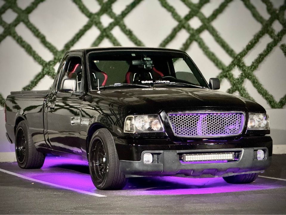 Speaking of pickup trucks with unexpected engine setups, this Ford Ranger has an LS under the hood. Sure, the truck's whole deal lets you know there's something going on — trucks with stock engines don't often have neon and bucket seats — but an LS? In a Ford?