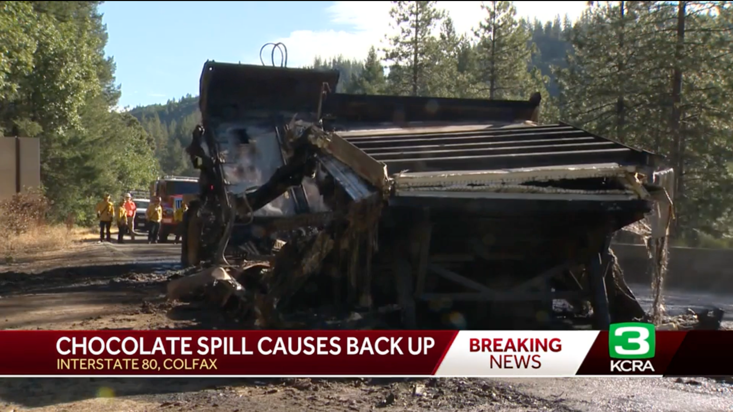 KCRA reports that on Monday, a semi-truck in Placer County, California caught on fire while carrying 40,000 pounds of chocolate, creating "a melty mess and traffic delays." According to Cal Fire, the fire started as the truck was traveling westbound on Interstate 80 at about 4:15 a.m. Apparently, the truck's brakes caught on fire, leading the driver to disconnect the trailer and pull off on the side of the road. While the driver is safe and uninjured, the trailer itself was completely destroyed.