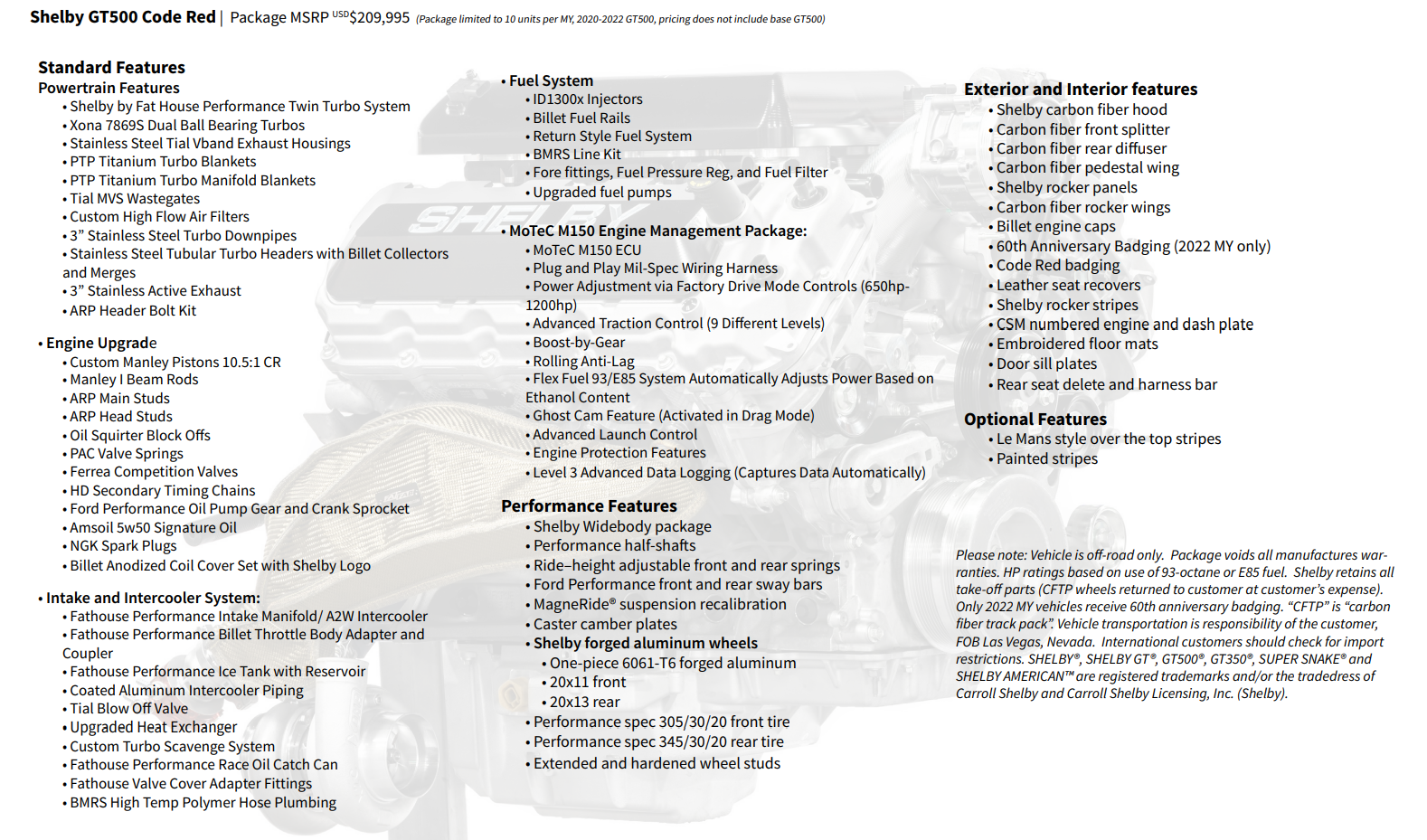 The pitch is the same: twin turbos, now producing 1,300 HP and 1,000 lb-ft of torque. At least on E85 ethanol — using 93 octane will limit you to just 1,000 horsepower and 780 lb-ft. Hopefully you can live with that. Shelby will make 30 in total, 10 each for model years 2020, '21 and '22. Sans the roughly $80,000 required for the donor GT500, the Code Red will set back those brave enough to attempt to tame it $209,995.