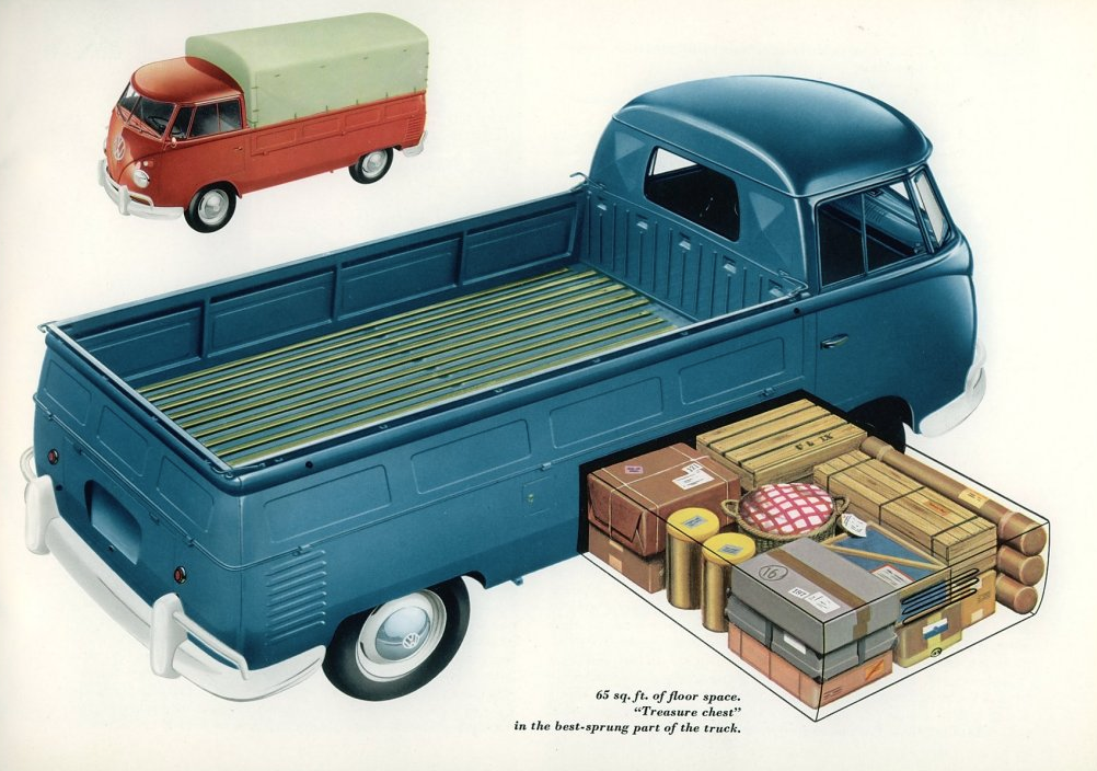 Of course, large, regularly-shaped trunk volumes are the easiest to accomplish this with; just look at this old Volkswagen Commercial Vehicles brochure, which shows a lovely (if artistically fabricated) collection of stuff that fits perfectly into the large, rectangular, under-bed trunk of the Type 2 Pickup: