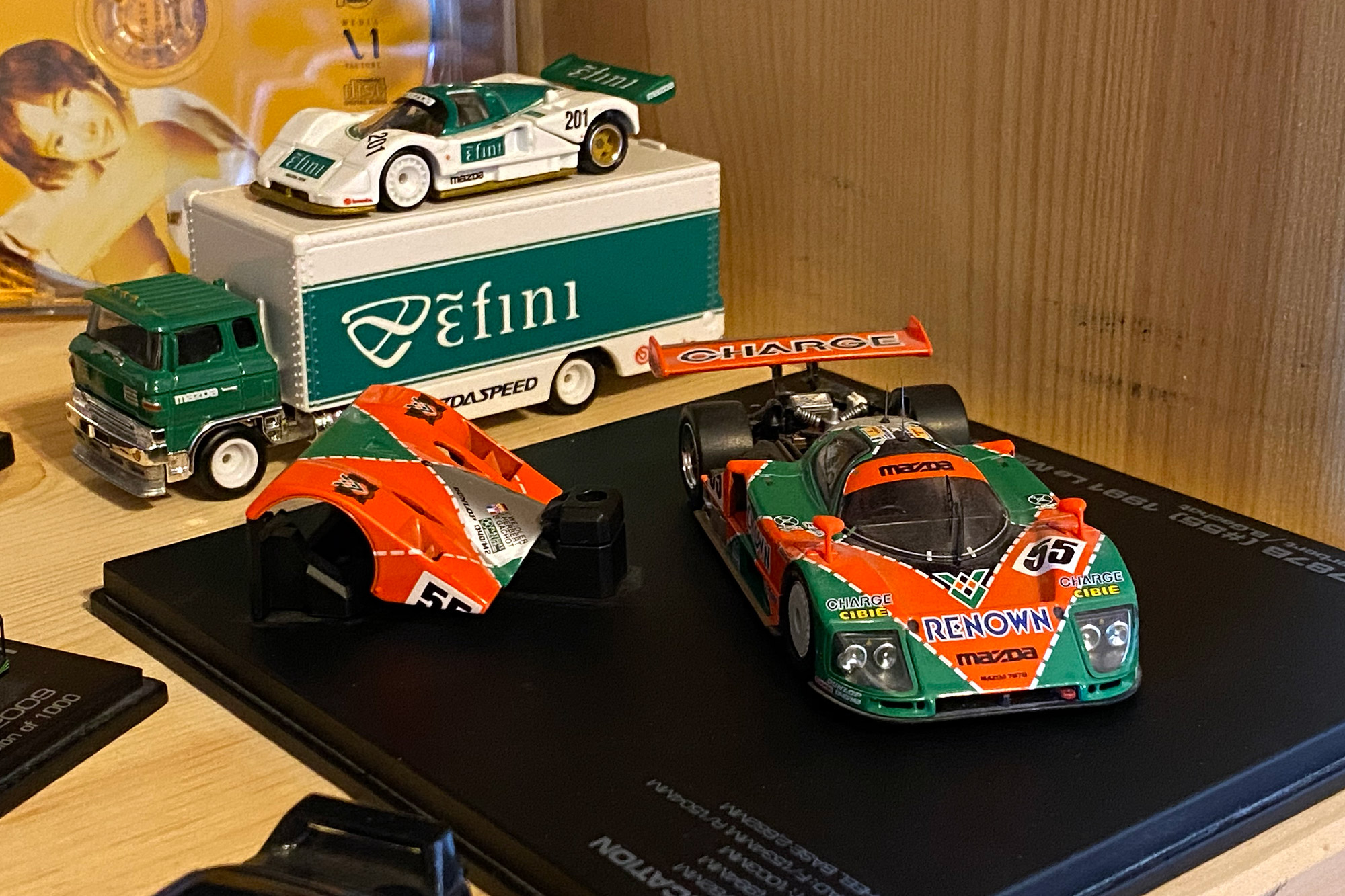 On the non-rally shelf, we have not one but two Mazda 787Bs, again courtesy of HPI and Mattel. The Hot Wheels one on top of the carrier blows my mind. It's inconceivable to me that we live in a time where you can walk into a Target and buy a Group C diecast, and I'm genuinely amazed Mazda let Mattel use the ɛ̃fini logo to recreate one of the 787B's lesser-known liveries. If you don't know, ɛ̃fini was one of Mazda's bubble-era sub-brands in the '90s, though it never left Japan. I'm not certain anyone from the company's American arm has ever acknowledged it, which is what makes the existence of this Hot Wheels in 2020 so surreal to me.