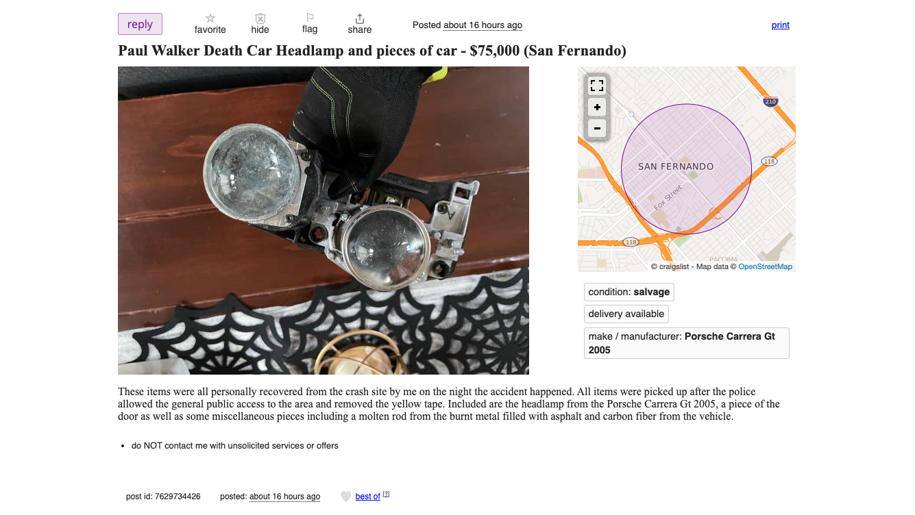The Craigslist post is for a piece of the car's headlight and number of other things that were around when Walker was killed in his 2005 Porsche Carrera GT.