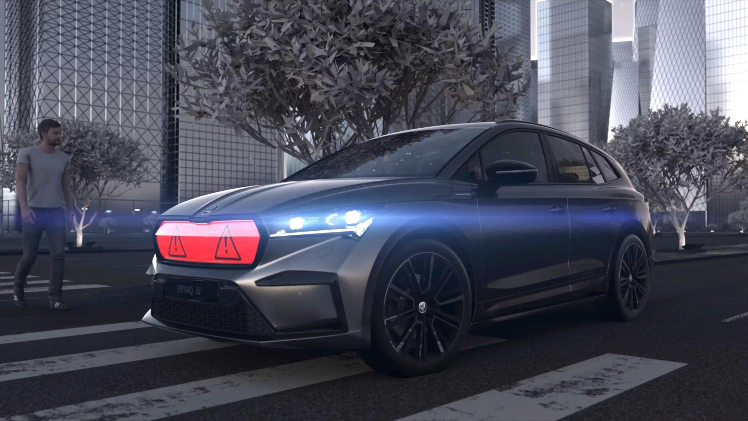 The carmaker refers to it as a "smart stop light," and during the development of the IPA2X, Škoda started to tinker with the concept of adding visual warnings to cars themselves. The idea is that the IPA2X and visual warnings of the Škoda Enyaq iV together could provide unavoidable safety cues for pedestrians.