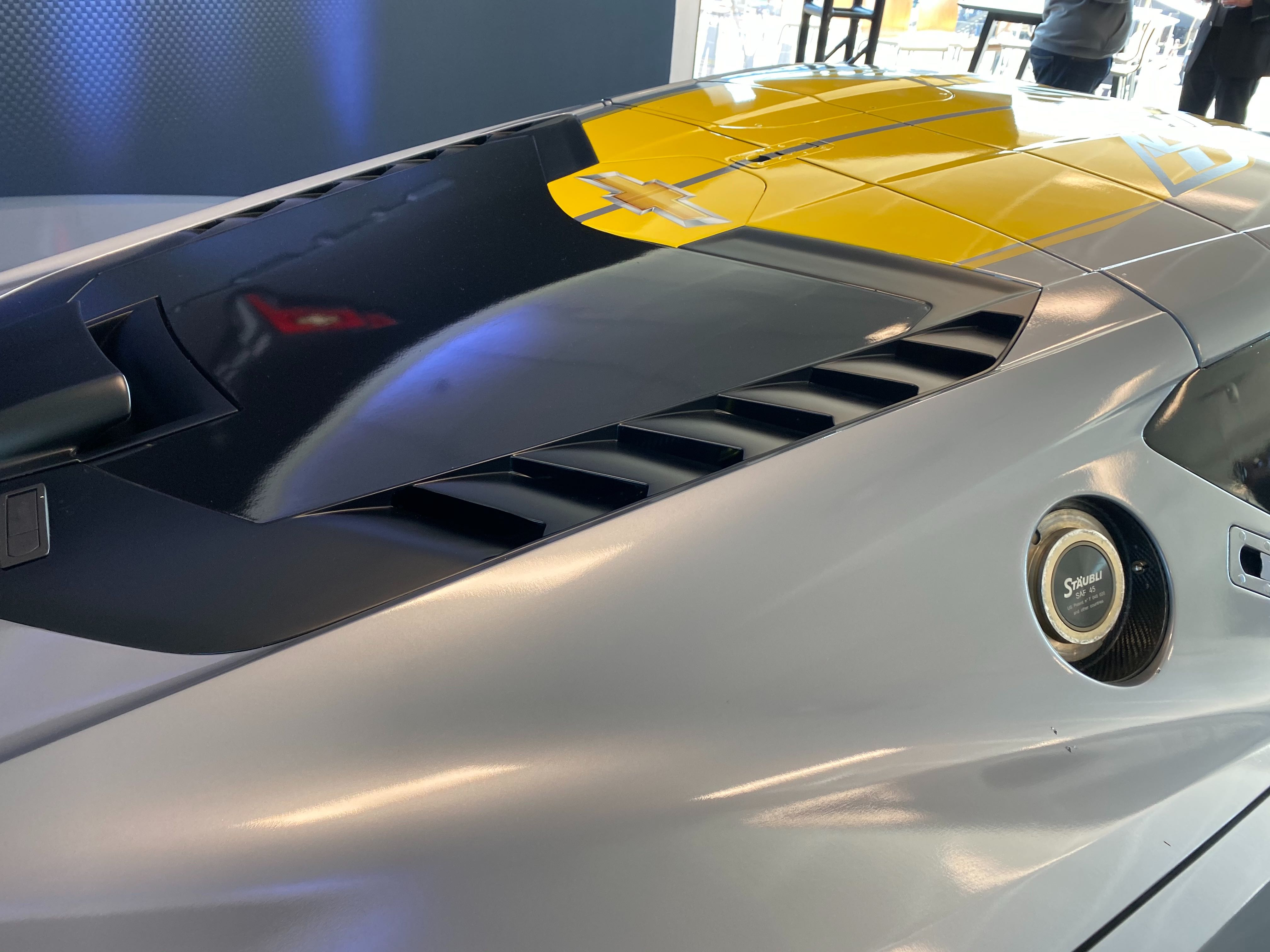 Although it eventually ends up hitting that mandated restrictor, the inlet for the race car has been optimized to get as much fresh air as possible and juts out from the bottom of the hatch to catch the air coming over the roof. The airflow from the roof is pointed in that direction from an area of the hood and roof that Chevy designer Vlad Kapitonov calls the "reverse mohawk" due to its long and indented shape.