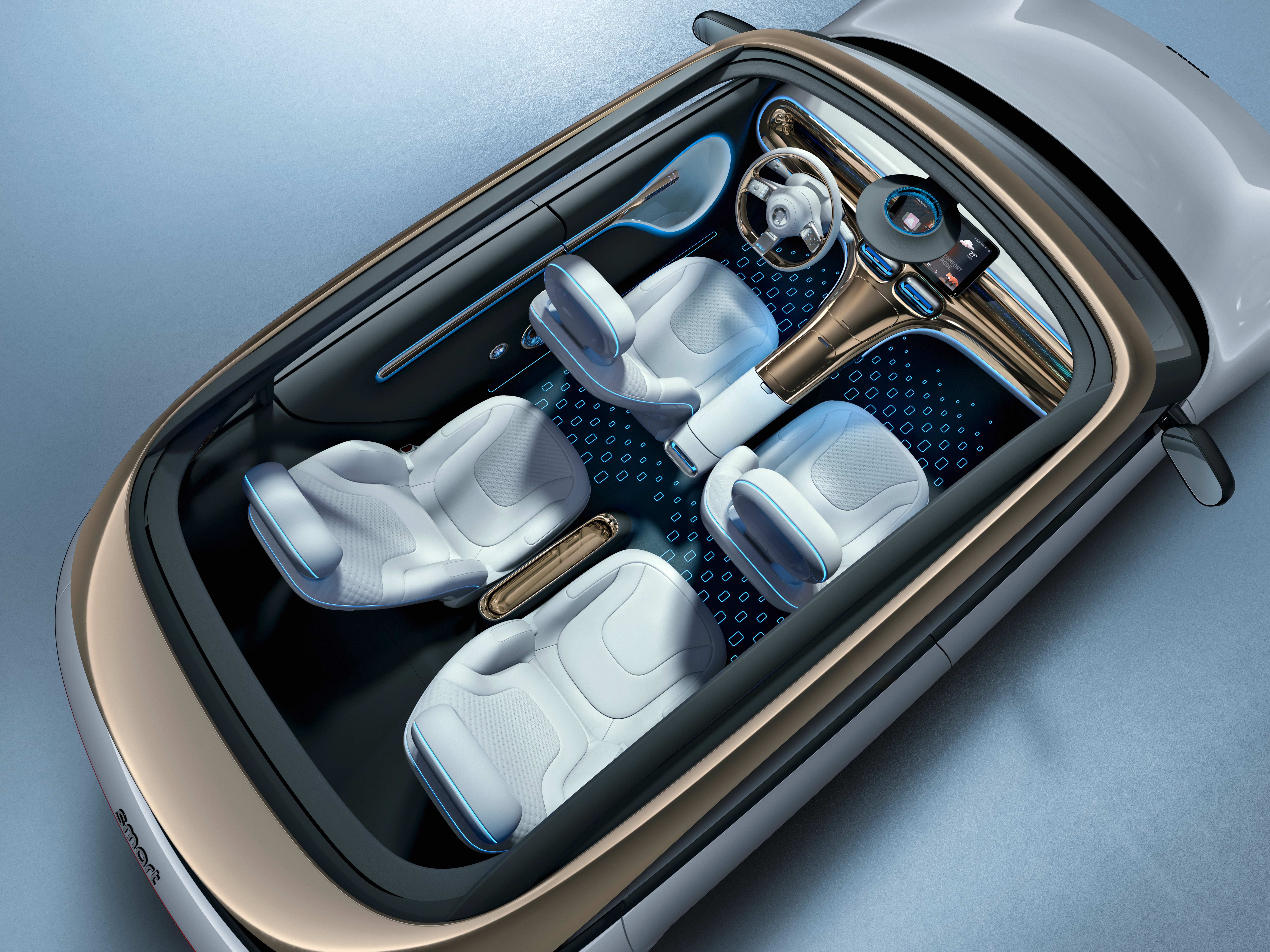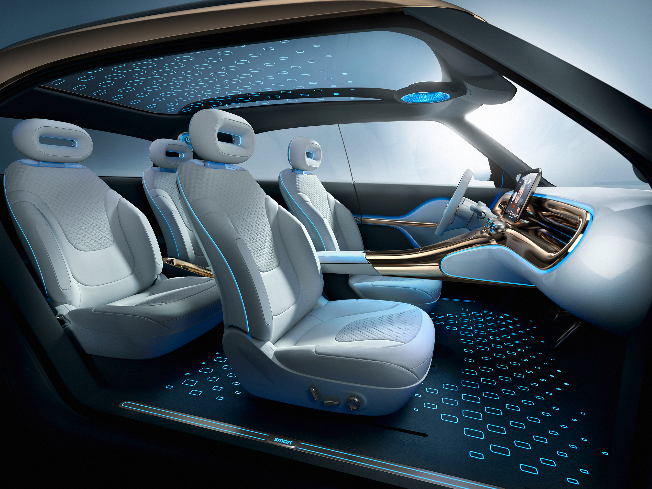 Smart describes it as having the comfort and space of a business sedan. Entry to the interior is gained through touch-capacitive light panels. The concept features a glass roof that stretches over the entirety of the passenger cabin and its wheelbase is 108.3 inches, pushing the wheels out to the corners.