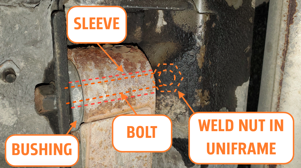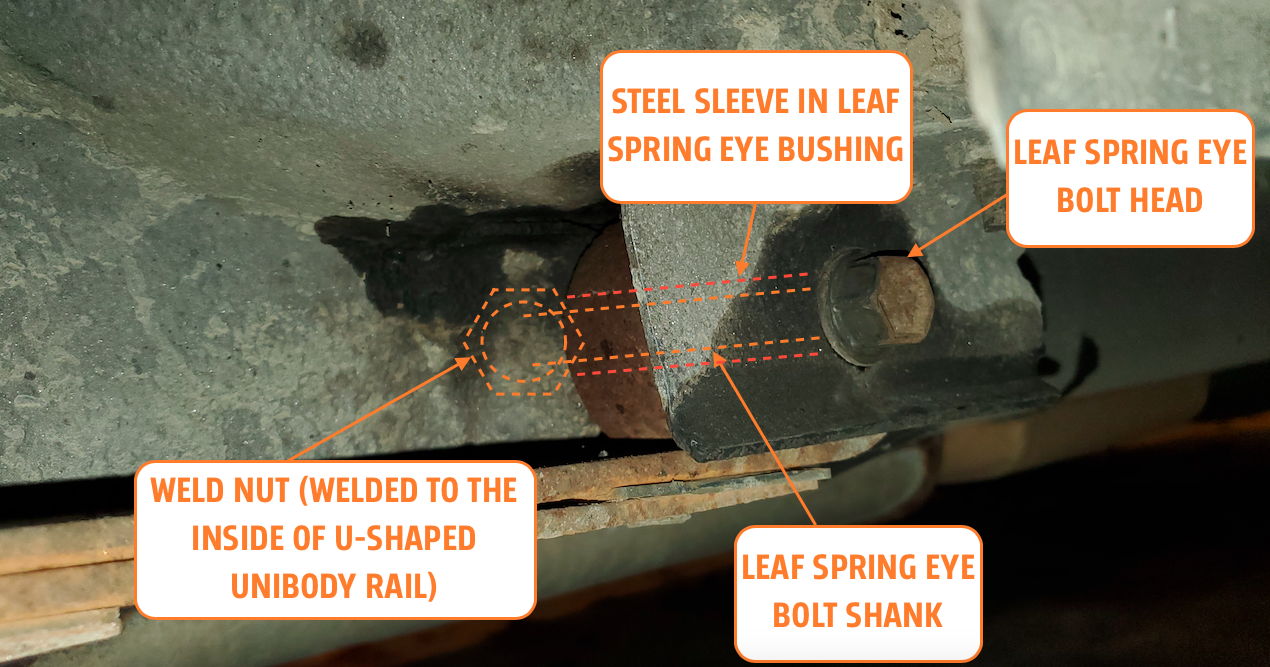 The solution, then, is simple, but awful. I'm going to have to cut my front leaf spring eye with an angle grinder, cut the rubber bushing out with a saw, and then heat up where the bolt goes into the unibody weld nut. Then I'm going to have to grab the metal sleeve with vice grips and rotate it until it's unseized from the bolt, allowing the fastener to move axially without ruining the weld nut threads.