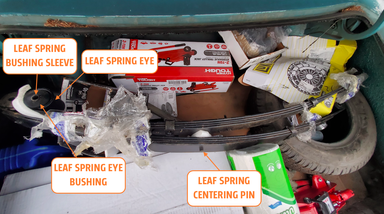 Before I go any further, allow me to quickly discuss the anatomy of a leaf spring. A leaf spring pack consists of a bunch of leaves all bolted together via a centering pin, which slots into a hole in the axle. The centering pin is important because it not only squishes the leaves together to create a single pack, but it also takes up the shear loads from the axle. Leaf springs are tasked not just with taking up vertical loads from road bumps, but also lateral loads (coil springs, by contrast, don't take lateral loads, as they would just bend; coil sprung solid axle suspensions use track bars to handle lateral loads). At each end of a spring pack is a spring eye, which is part of the main leaf at the top of the pack. In each eye is a bushing with a steel sleeve at its center.
