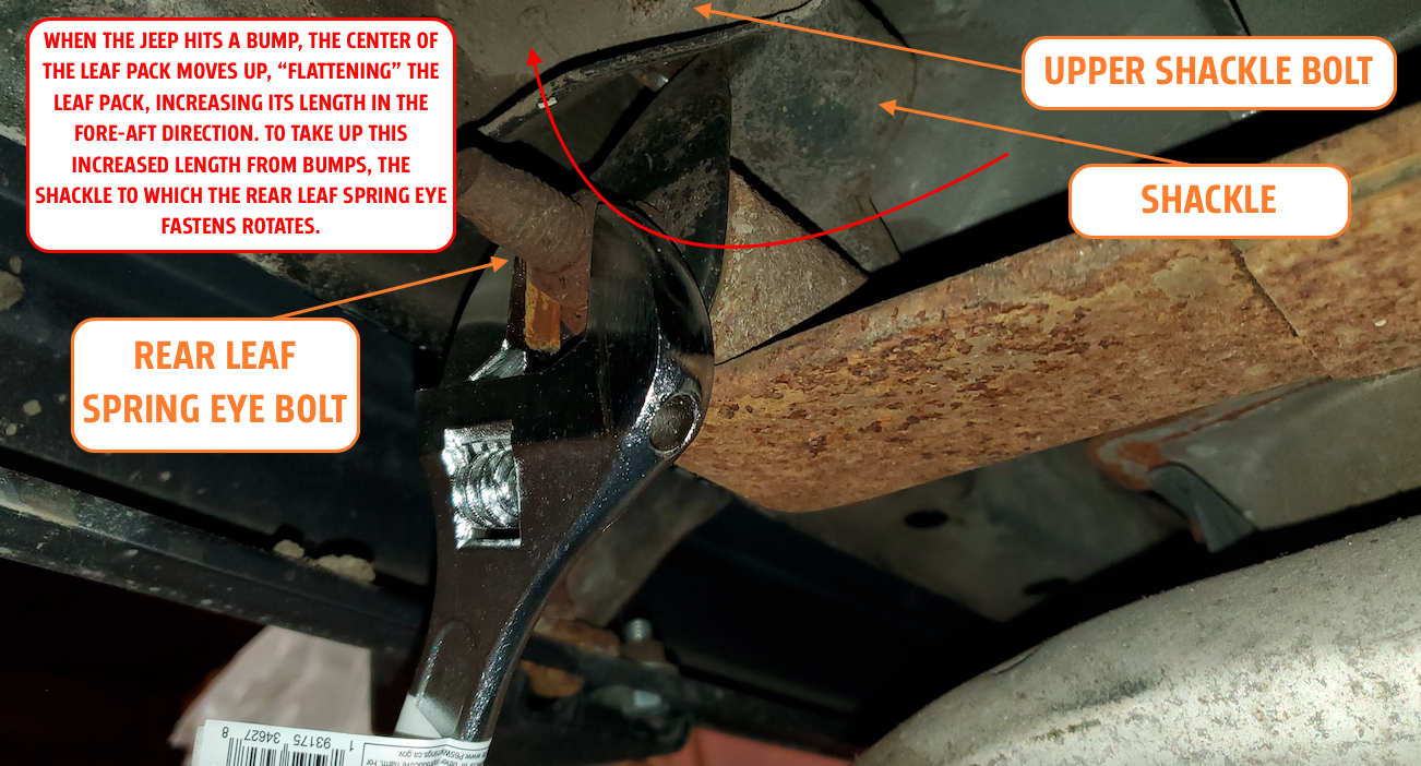 The problem with my XJ is that the bolts going through the front leaf spring eye bushings' sleeves (see below) are either seized to the weld nut in the unibody, or seized to the metal sleeve. Either way, spinning the bolts out is borderline impossible.