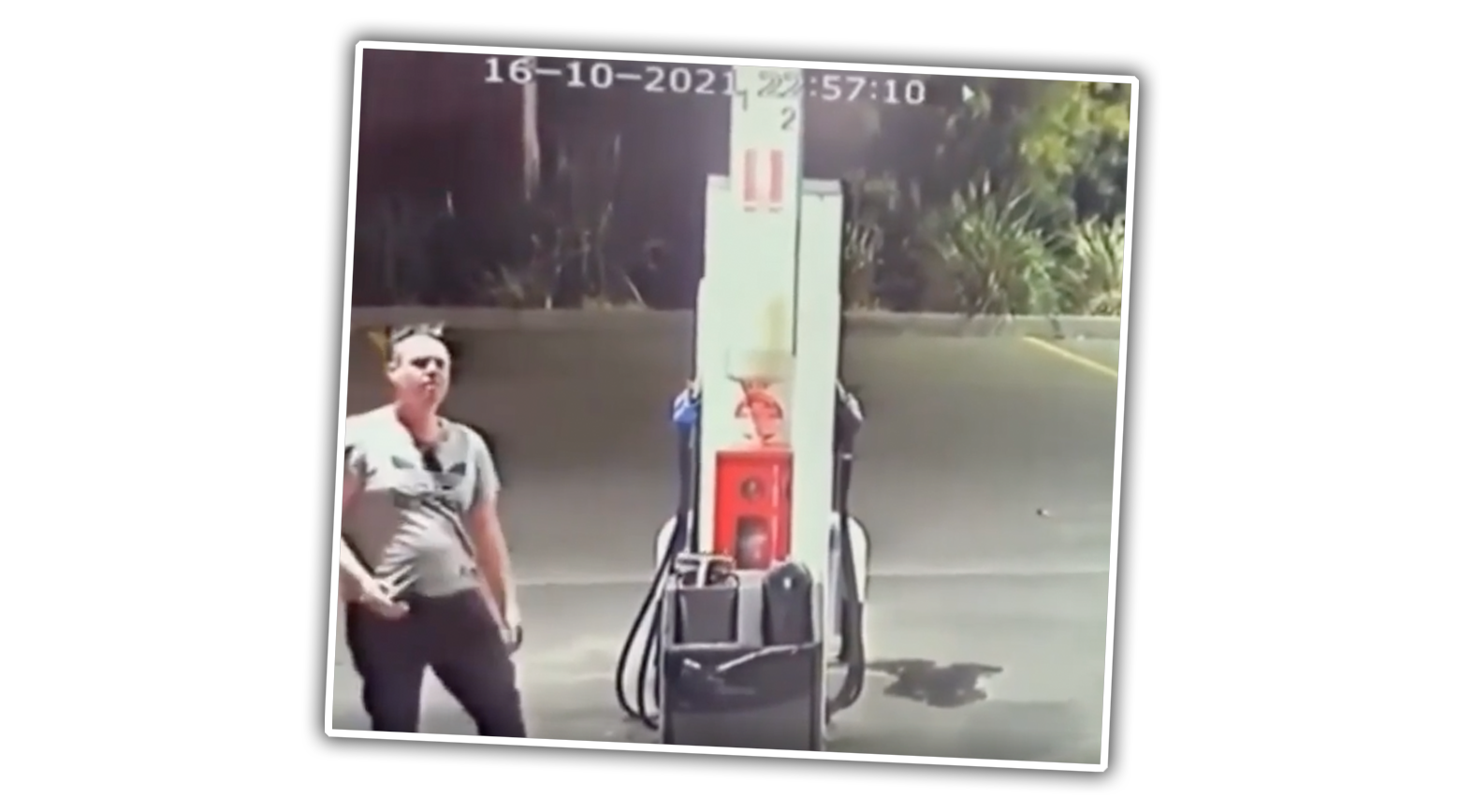 Okay, so, the dude enters a gas station on foot and approaches the pumps. Ordinarily, one would likely want some manner of automobile or at least a can designed to hold fuel for an automobile in this context. But not our Adidas-shirt-wearing pedestrian here.