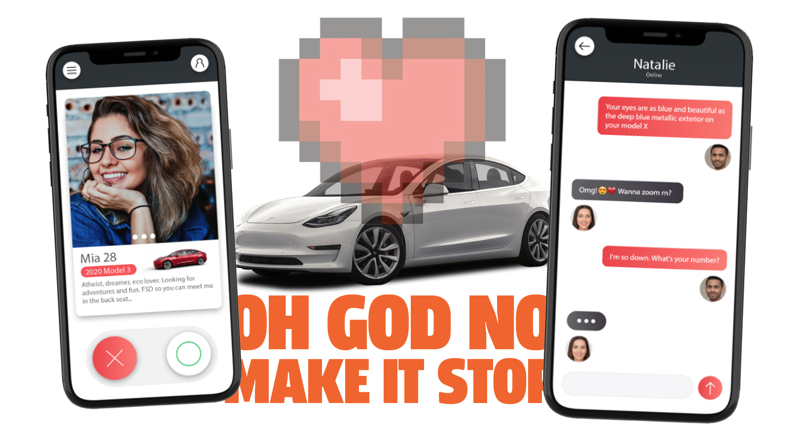 The Tesla Dating site—which will require proof of Tesla ownership—has a bunch of mocked-up images of imagined conversations between horny and available Tesla owners, seemingly written by someone who has never successfully convinced a fellow human to go on a date with them: