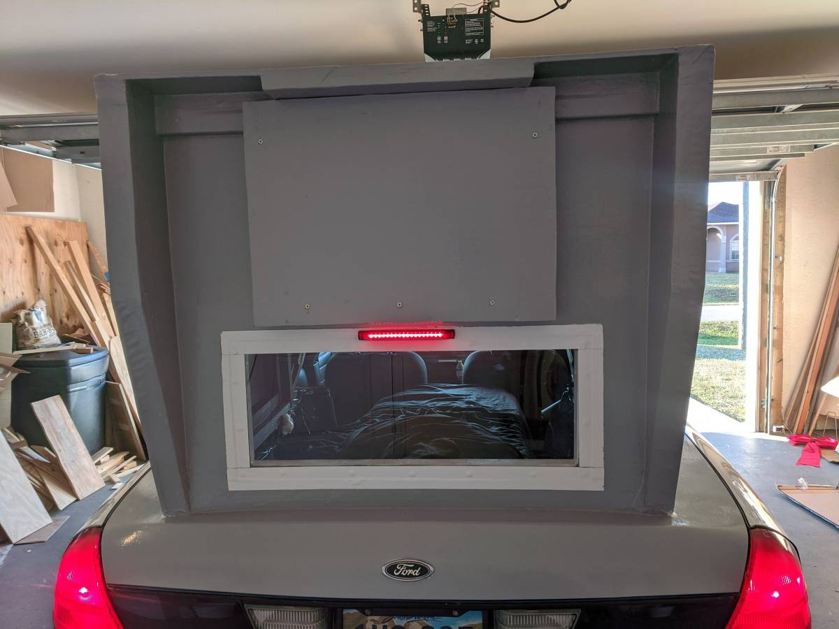 Al said he took a sawzall to the roof and trunk lid (he noted that the Crown Vic's body-on-frame construction allowed him to do this without affecting chassis rigidity), and removed the police cruiser's rear window. "I did it low cost but built it extra sturdy," he told me, saying that he had no welder and that "[the camper is] all wood on the bottom."