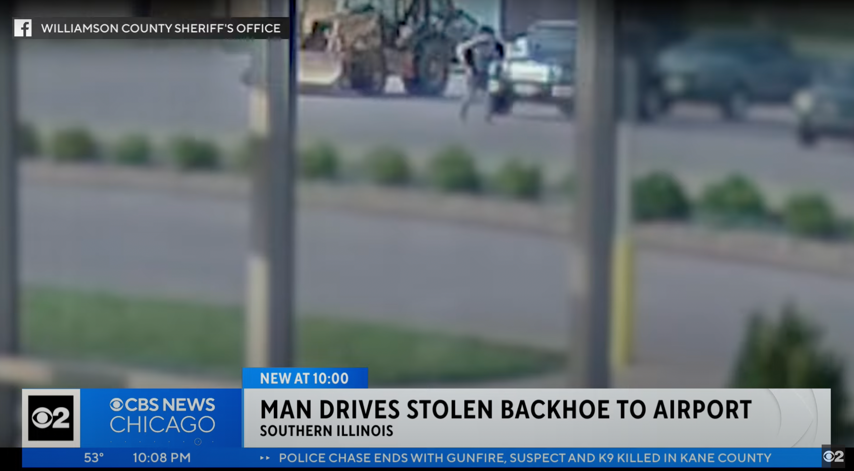 The Williamson County (Illinois) Sheriff's Office released a press statement on Tuesday saying that a man had stolen a backhoe to drive 10 miles to catch a flight at a local airport, which he entered with a guitar case in hand. On Wednesday, the Sheriff's Office gave an update, because "the office has received numerous inquiries regarding this matter."