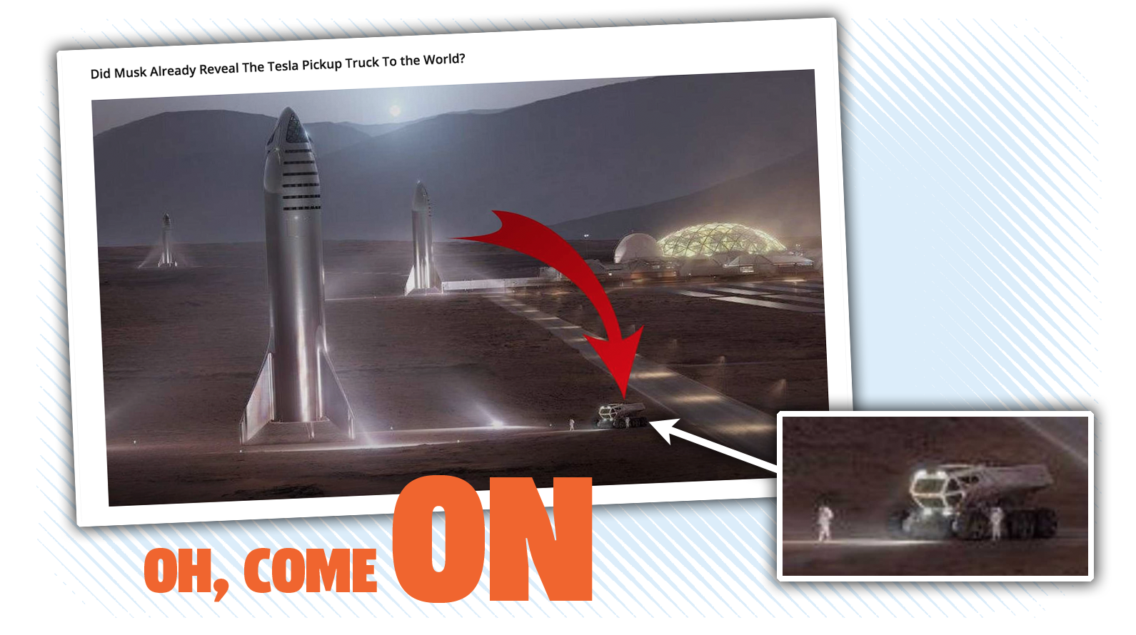 Jeezis, this tweet is months old, even. Nothing about any of this SpaceX tweet has anything to do with Tesla's upcoming truck. I didn't think things could get much more absurd than last week's shitty render, but here we are.