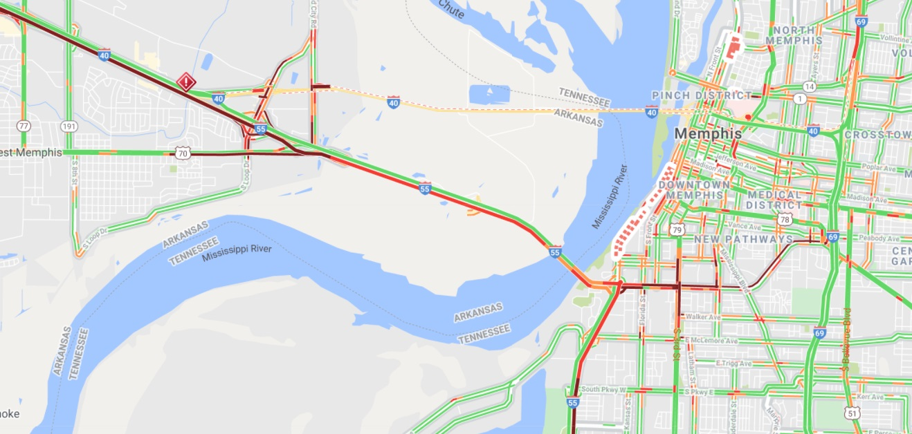 A cursory check of idrivearkansas.com shows that I-40 is indeed closed, and the reroute recommended on I-55 is severely backed up due to the massive influx of traffic. I imagine things will get significantly worse as morning and afternoon commutes continue to get backed up.