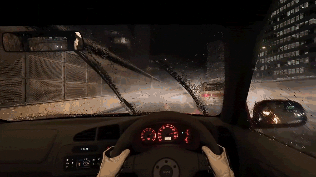 Jusupov's work is something to behold. The disparate drops collect and move en masse across the windshield; snaking, melding together and swaying left and right, opposite the car's direction of travel. The wipers work together to move all the liquid over and down, just like on a real car, leaving dry streaks behind as they oscillate. I know this all seems unremarkable in text, but the second you see it in action, you realize this level of detail simply isn't observed in other racing games. Games developed by actual companies. Take the technical darling that is GT7, for example: