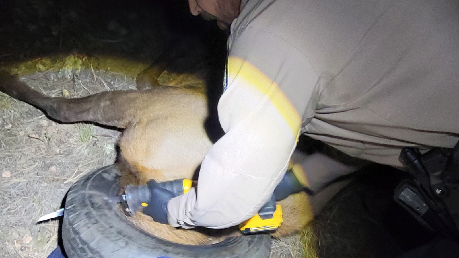 Officer Clay had a pretty good reason why that was not done: how well do you think you could do if you had to Sawzall a tire off a 600 pound animal's neck with only inches to spare, without cutting the animal? It's not so easy.