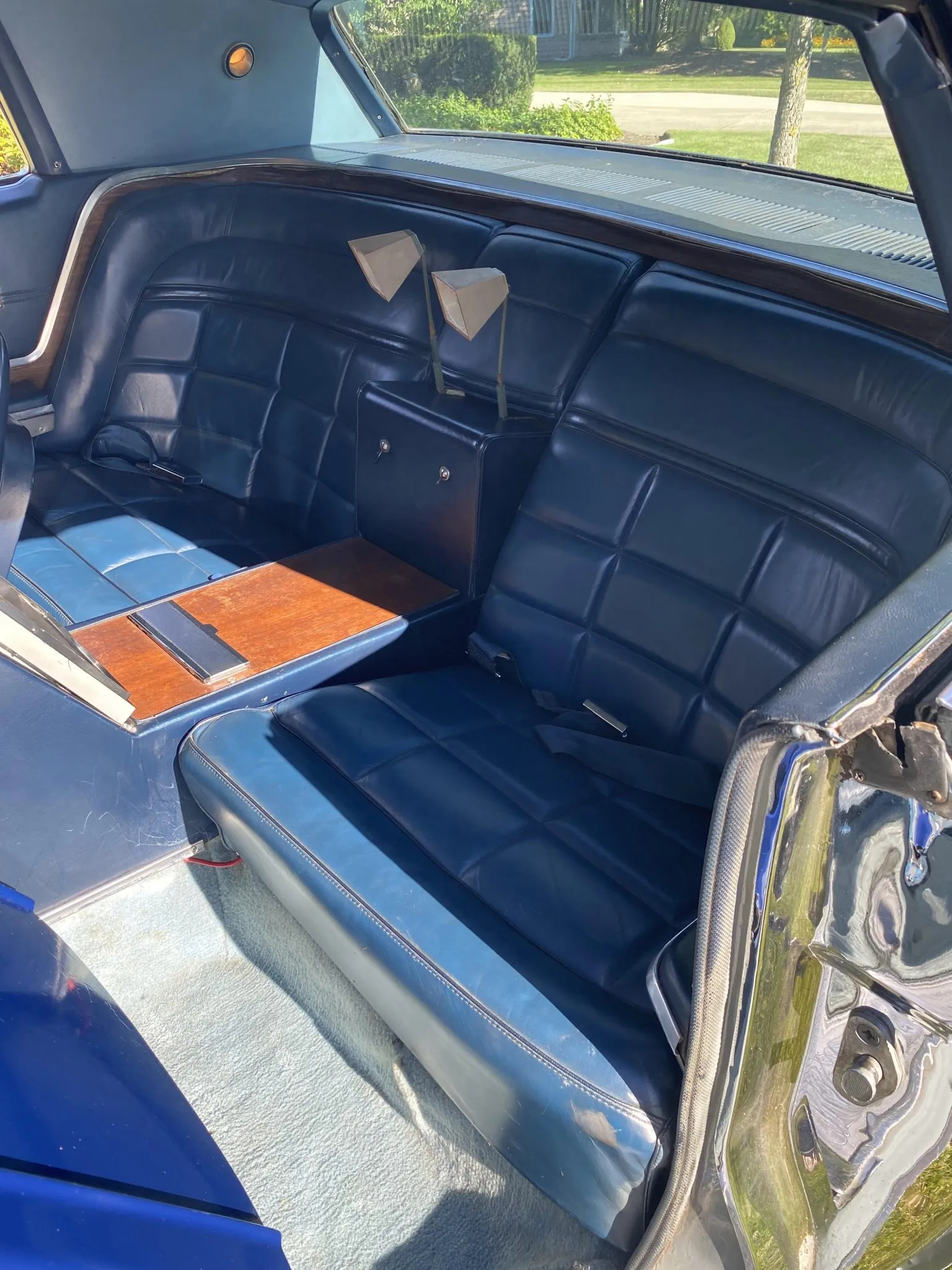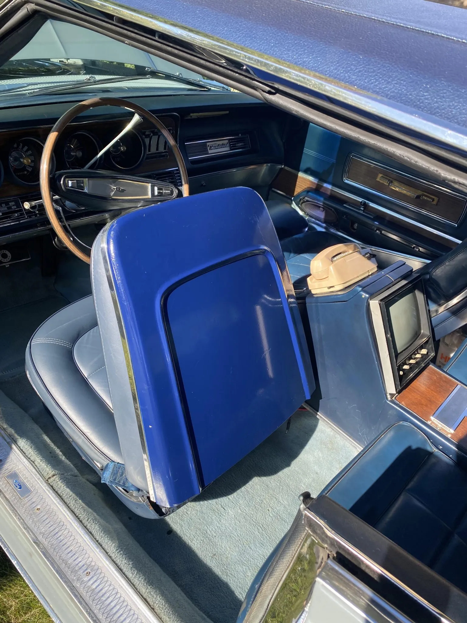 The Thunderbird Apollo distinguishes itself from other, more pedestrian 1967 T-Birds with upgrades like that blue Landau top, woodgrain interior accents, hilarious looking rear-seat reading lamps, fold-down rear trays, and a large center console that showcases a precariously mounted beige radio phone for front seat passengers and a television for rear seat passengers. In reading the included original press release for the Apollo, Ford claims that the car's 428-cubic-inch V8 produced 345 horsepower routed through a three-speed automatic transmission, so unlike a lot of wheezy '70s Malaise era boats, it could move out of its own way even with all of the added luxury amenities.