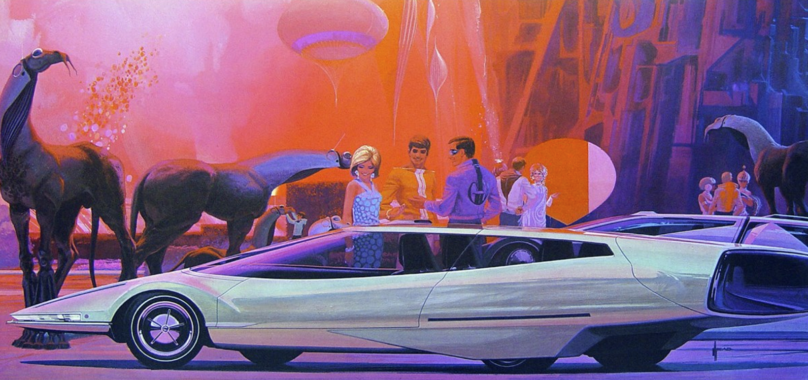 Mead left Ford to do more illustration work, including a catalog for United States Steel, which featured many wildly futuristic—yet still plausible—cars in stylish futuristic environments, populated by heathy, attractive future-humans who seemed to have everything pretty well figured out.