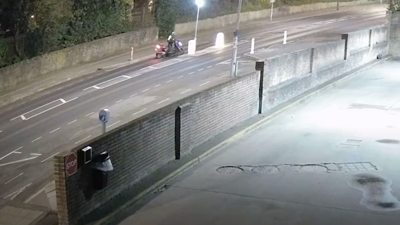 In the footage, the man is seen stopping next to two bollards. He then carefully lays his bike down, before crawling underneath it.