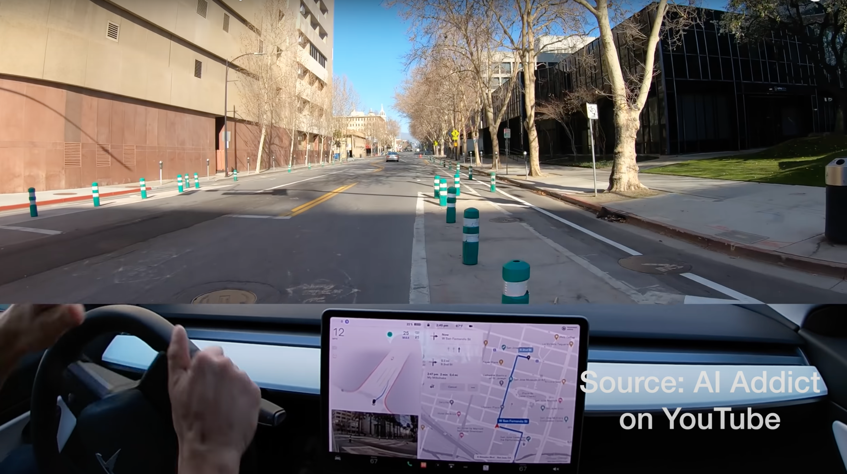 YouTuber and FSD Beta Driver AI Addict posted a video that shows the car running into a bollard that is used to protect a bike lane.