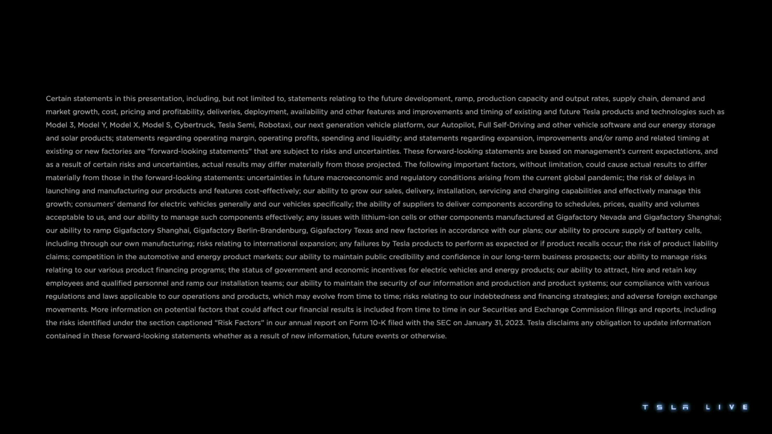 Certain statements in this presentation, including, but not limited to, statements relating to the future development, ramp, production capacity and output rates, supply chain, demand and market growth, cost, pricing and profitability, deliveries, deployment, availability and other features and improvements and timing of existing and future Tesla products and technologies such as Model 3, Model Y, Model X, Model S, Cybertruck, Tesla Semi, Robotaxi, our next generation vehicle platform, our Autopilot, Full Self-Driving, and other vehicle software and our energy storage and solar products; statements regarding operating margin, operating profits, spending and liquidity; and statements regarding expansions, improvements and/or ramp and related timing at existing or new factories are "forward-looking statements" that are subject to risks and uncertainties. These forward-looking statements are based on management's current expectations, and are a result of certain risks and uncertainties, actual results may differ materially from those projected. The following important factors, without limitation, could cause actual results to differ materially from those in the forward-looking statements: uncertainties in future macroeconomic and regulatory conditions arising from the current global pandemic; the risk of delays in launching and manufacturing our products and features cost-effectively; our ability to grow our sales, delivery, installation, servicing and charging capabilities and effectively manage this growth; consumers' demand for electric vehicles generally and our vehicles specifically; the ability of suppliers to deliver components according to schedules, prices, quality and volumes acceptable to us, and our ability to manage such components effectively; any issues with lithium-ion cells or other components manufactured at Gigafactory Nevada and Gigafactory Shanghai; our ability to ramp Gigafactory Shanghai, Gigafactory Berlin-Brandenburg, Gigafactory Texas and new factories in accordance with our plans; our ability to procure supply of battery cells, including through our own manufacturing; risks relating to international expansion; any failures by Tesla products to perform as expected or if product recalls occur; the risk of product liability claims; competition in the automotive and energy product markets; our ability to maintain public credibility and confidence in our long-term business prospects; our ability to manage risks relating to our various product financing programs; the status of government and economic incentives for electric vehicles and energy products; our ability to attract, hire and retain key employees and qualified personnel and ramp our installation teams; our ability to maintain the security of our information and production and product systems; our compliance with various regulations and laws applicable to our operations and products, which may evolve from time to time; risks relating to our indebtedness and financing strategies; and adverse foreign exchange movements. More information on potential factors that could affect our financial results is included from time to time in our Securities and Exchange Commission filings and reports, including the risks identified under the section captioned "Risk Factors" in our annual report on Form 10-K filed with the SEC on January 31, 2023. Tesla disclaims any obligation to update information contained in these forward-looking statements whether as a result of new information, future events or otherwise.