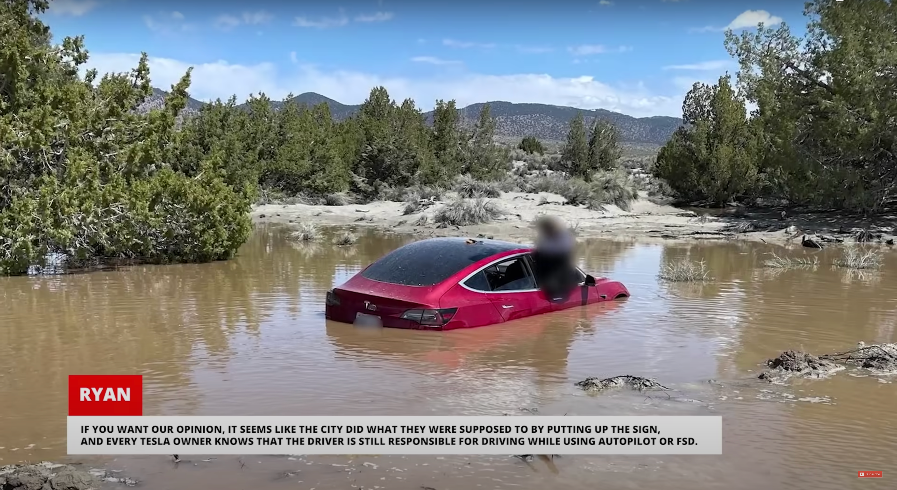 The driver, who is only identified as Ryan, apparently told the channel that he was driving down the highway outside Mono City at about 60 mph when FSD was activated. That's when the driver saw a sign warning of road flooding ahead, but neither the car nor Ryan reacted to the message. He told the outlet that there are tons of flood signs in the area with usually no water present. Despite the fact that pools of standing water can clearly be seen on either side of the roadway and ahead of the speeding Tesla, nothing is ever done to slow the car down before it hits the water.