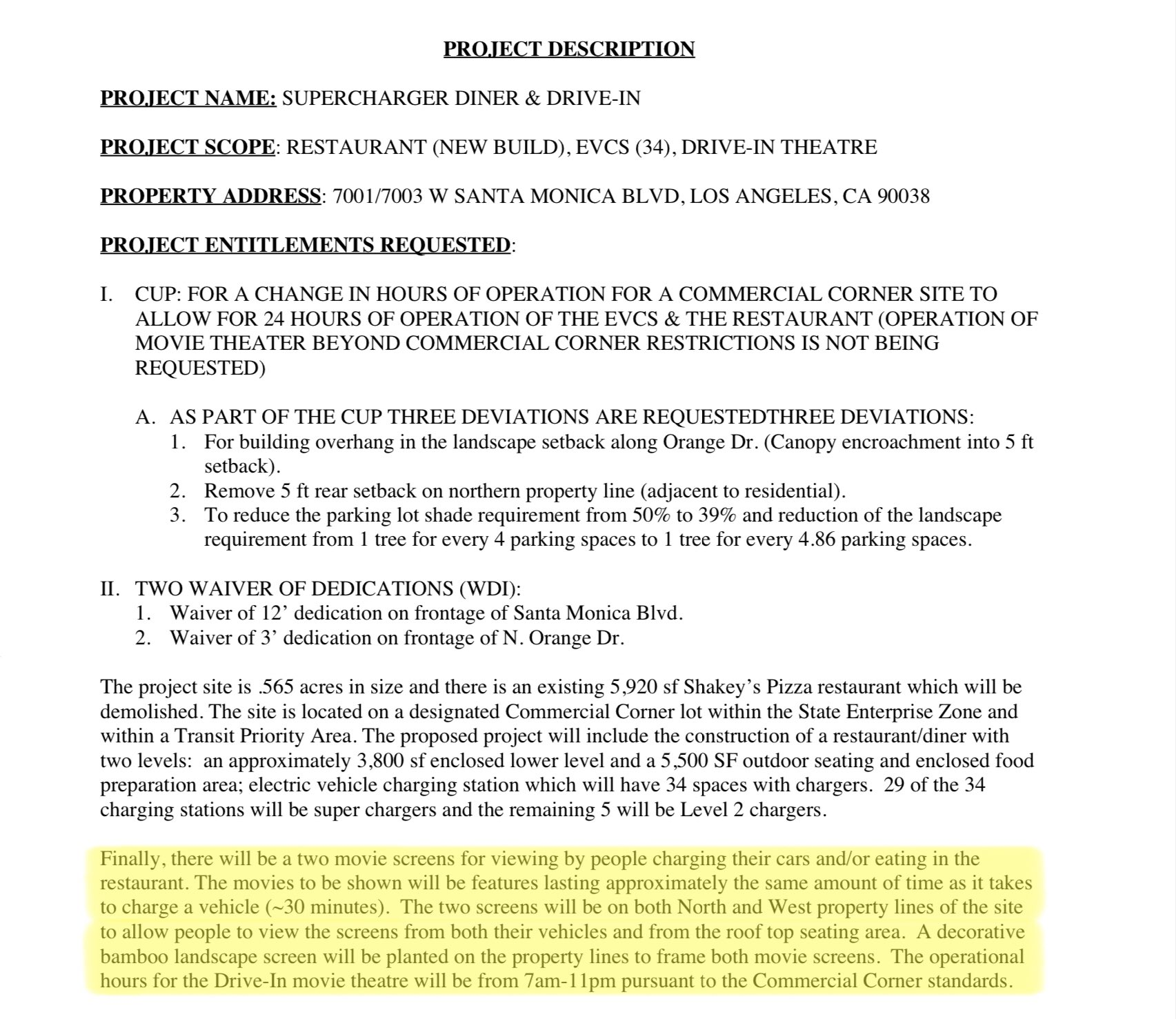 Originally, plans were in place to build a Supercharger with a diner in nearby Santa Monica. Back in 2018, Tesla had filed for permits in the city for such a place to be built. These plans fell through or something, as the location has now changed to Hollywood. The address for the permits and plans says 7001 Santa Monica Boulevard at the intersection of Orange Drive.