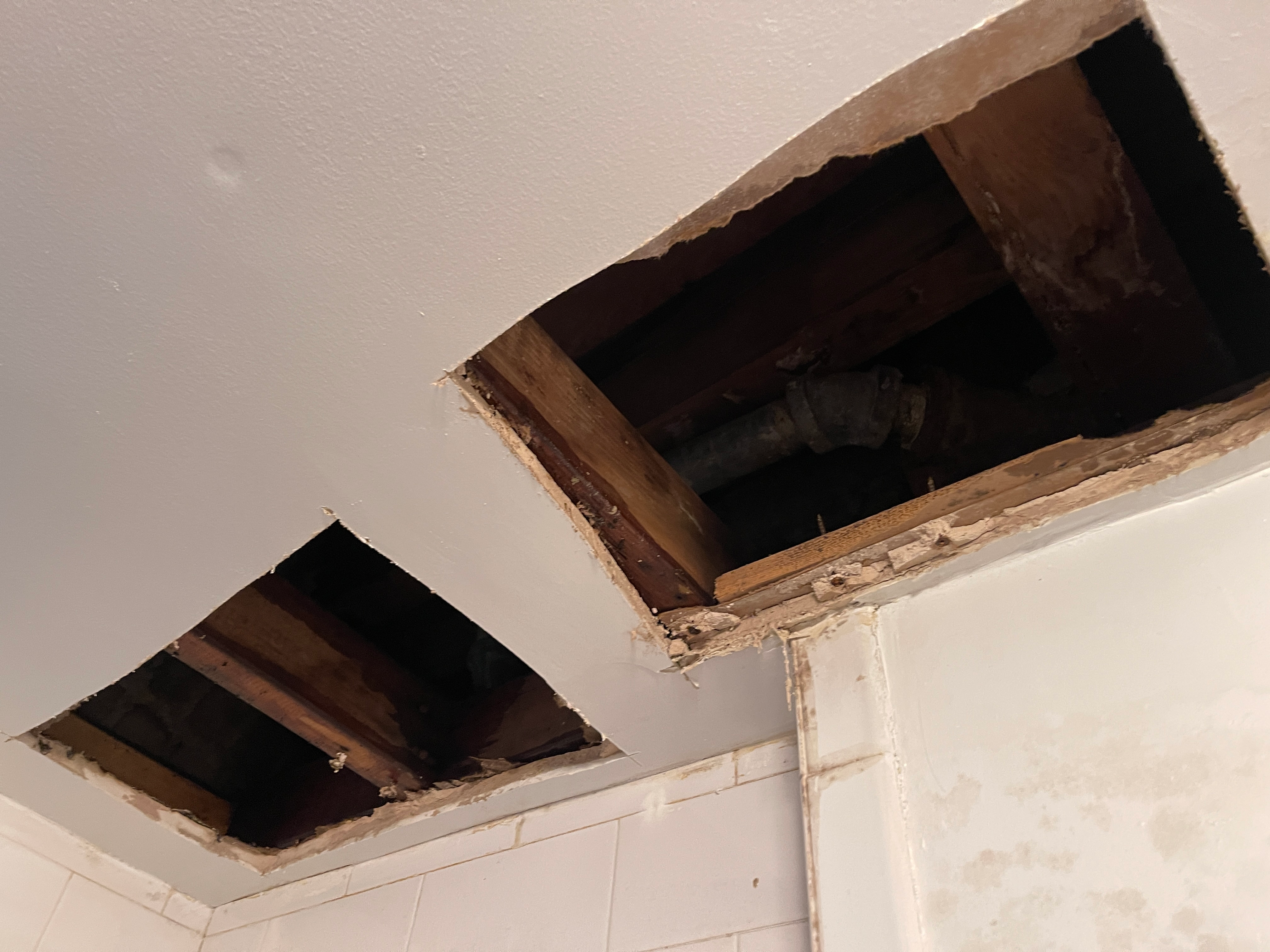 Water starting raining down from above. Now there are two large holes in my bathroom ceiling. Luckily, the maintenance guy has covered them in cardboard and let me know someone will fix it eventually.