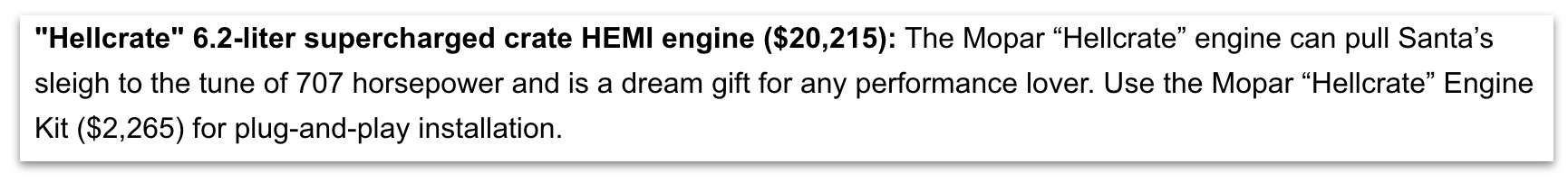 A Hellcat crate engine for each parent and sibling. A Hellcat crate engine for my uncle, who always tells me I'm smarter than he is even if I'll never be nearly as successful. (Smarts are what counts!) A Hellcat crate engine for my estranged aunt, who was always kind of a bitch anyway. Hellcat crate engines for the in-laws, who will surely make use of them immediately. (Who wouldn't?) Hellcat crate engines for little Jimmy and Timmy and Jane, who can swap out their Barbie Jeeps for big-kid Jeeps. A Hellcat crate engine for the White Elephant office party, since I misread that the limit is $20 instead of $20,000. Hellcat crate engines without gift tags for the stockings, in case I missed anyone.
