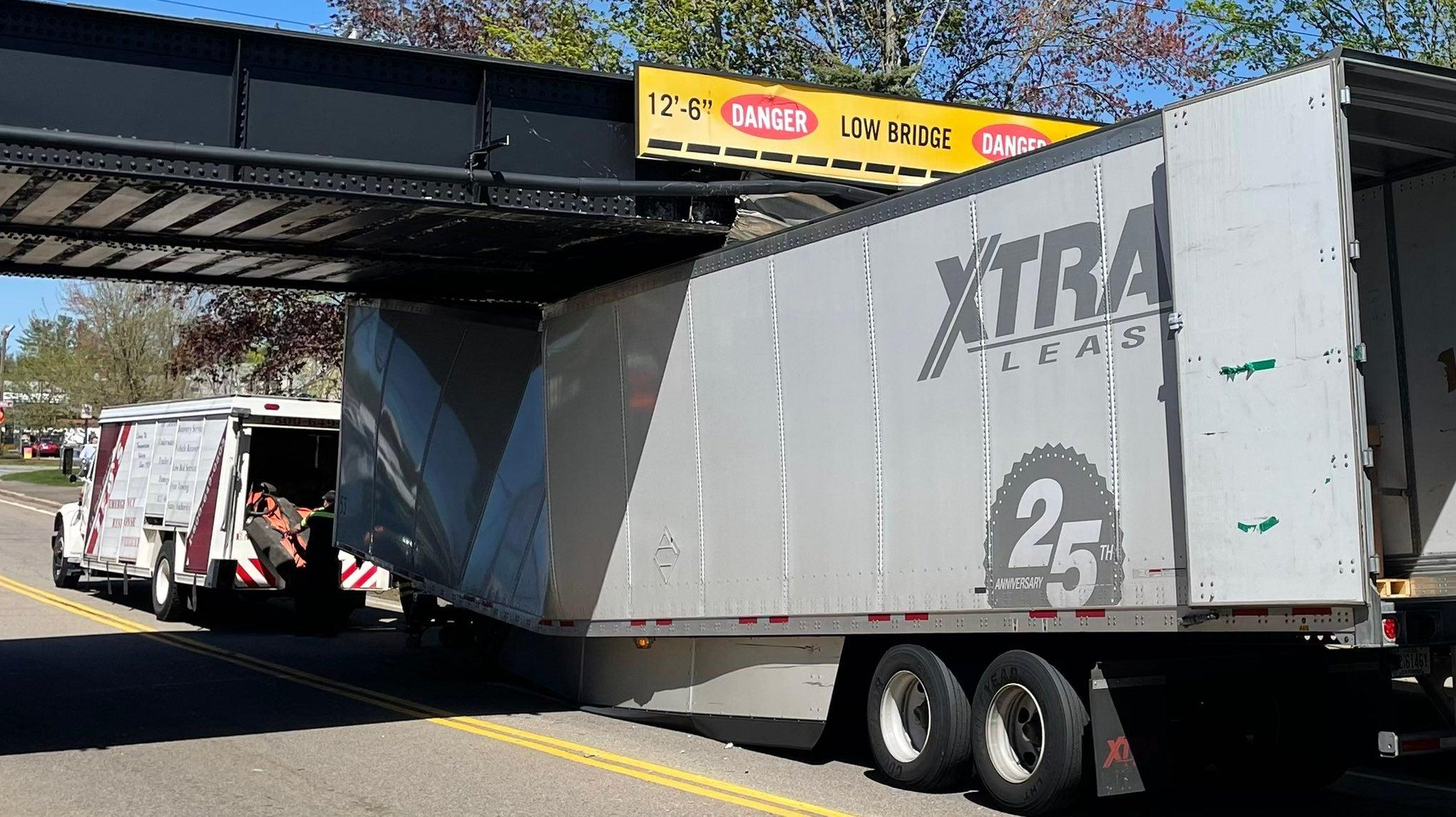 But that's not the only one. WHDH News Boston reported that a 12-foot, 6-inch clearance bridge in Westboro, Massachusetts, delivered some heavy carnage to a truck that failed to clear it on Thursday.