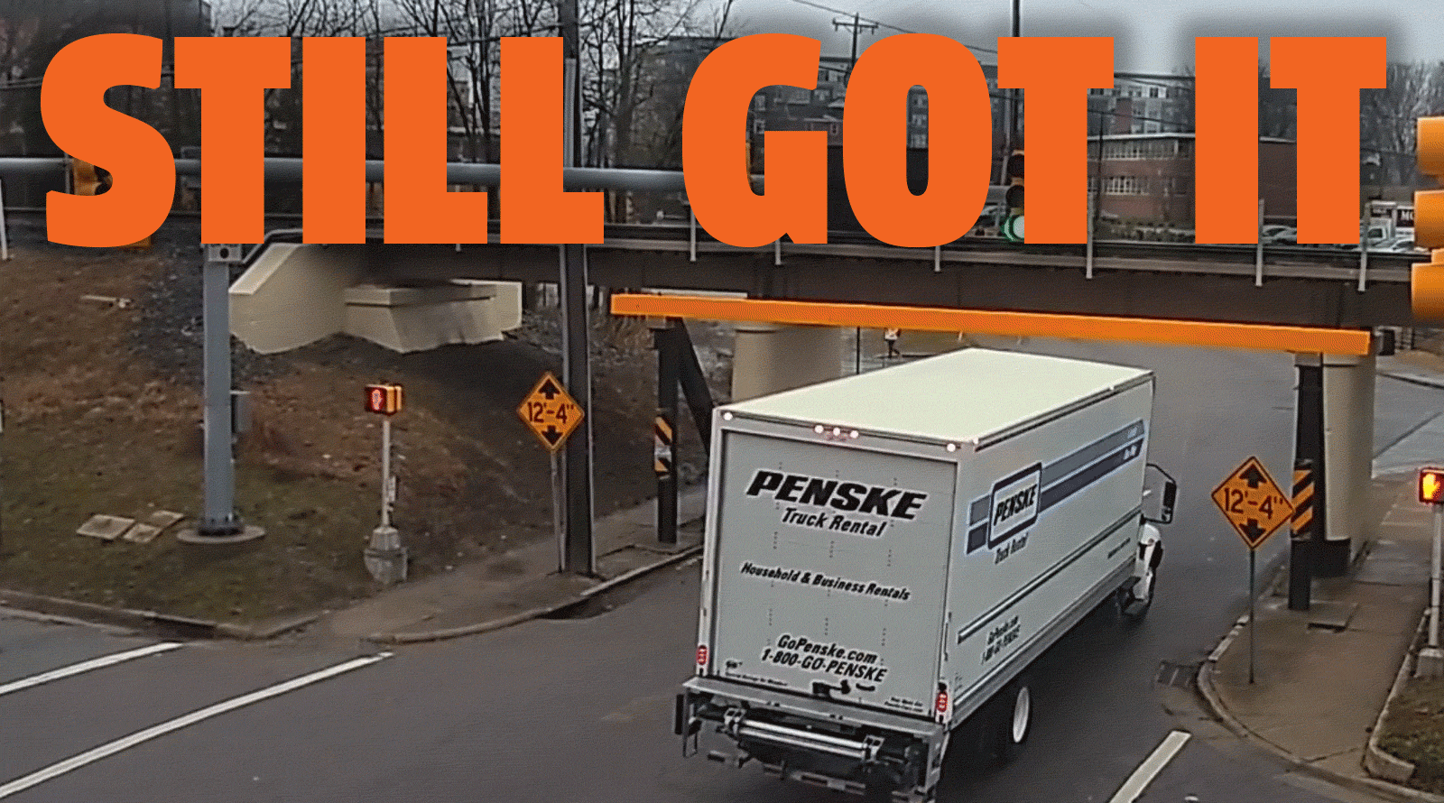 Sooooo close! That roof got very exfoliated, and I suspect a lot of those pieces fell down into the truck. I like how you can almost feel the confusion and slow burn of the driver as they come to an uncertain stop right after the bridge. That's the moment where the driver is wishing, fervently, to be able to go back in time two minutes.