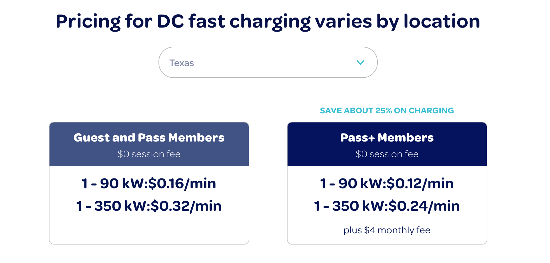 Let's start with the charge pricing. While Electrify America would love to charge you based on power usage, some states explicitly forbid that — forcing the company to charge by the minute in those jurisdictions instead. In Texas, which is a per-minute state, charge speeds over 90 kW do in fact cost $0.32 per minute. So far, so good.