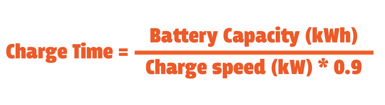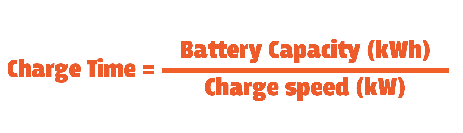 Here's the general formula for how long it takes an EV to charge its battery: take your battery capacity (in kWh) and divide by your charge speed (in kW). Dimensional analysis! The units on the bottom cancel the units on top, bada bing bada boom, you've got your charge speed in hours. A 200 kWh battery charging at 100 kW? That'll take you two hours to fully charge.
