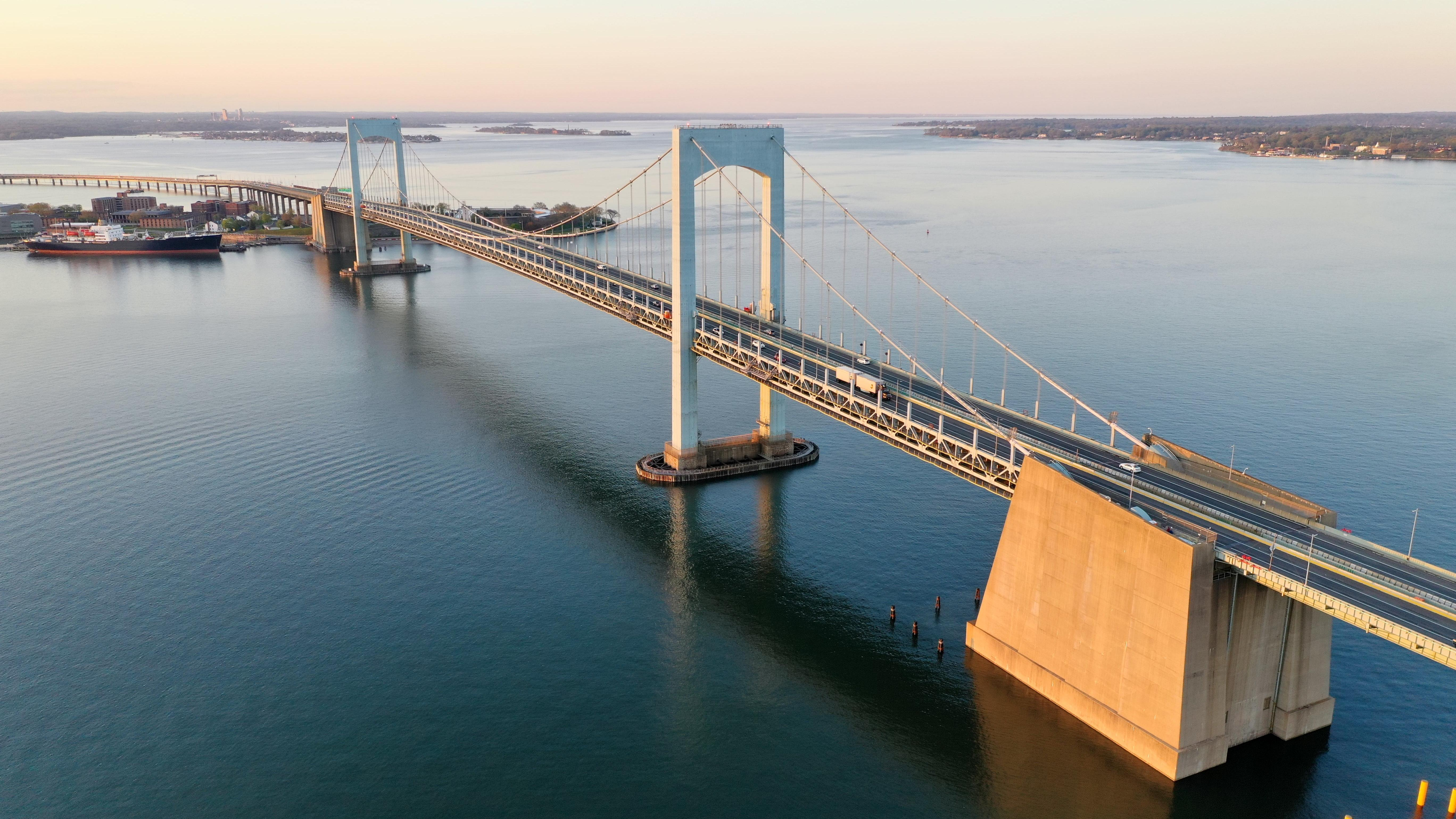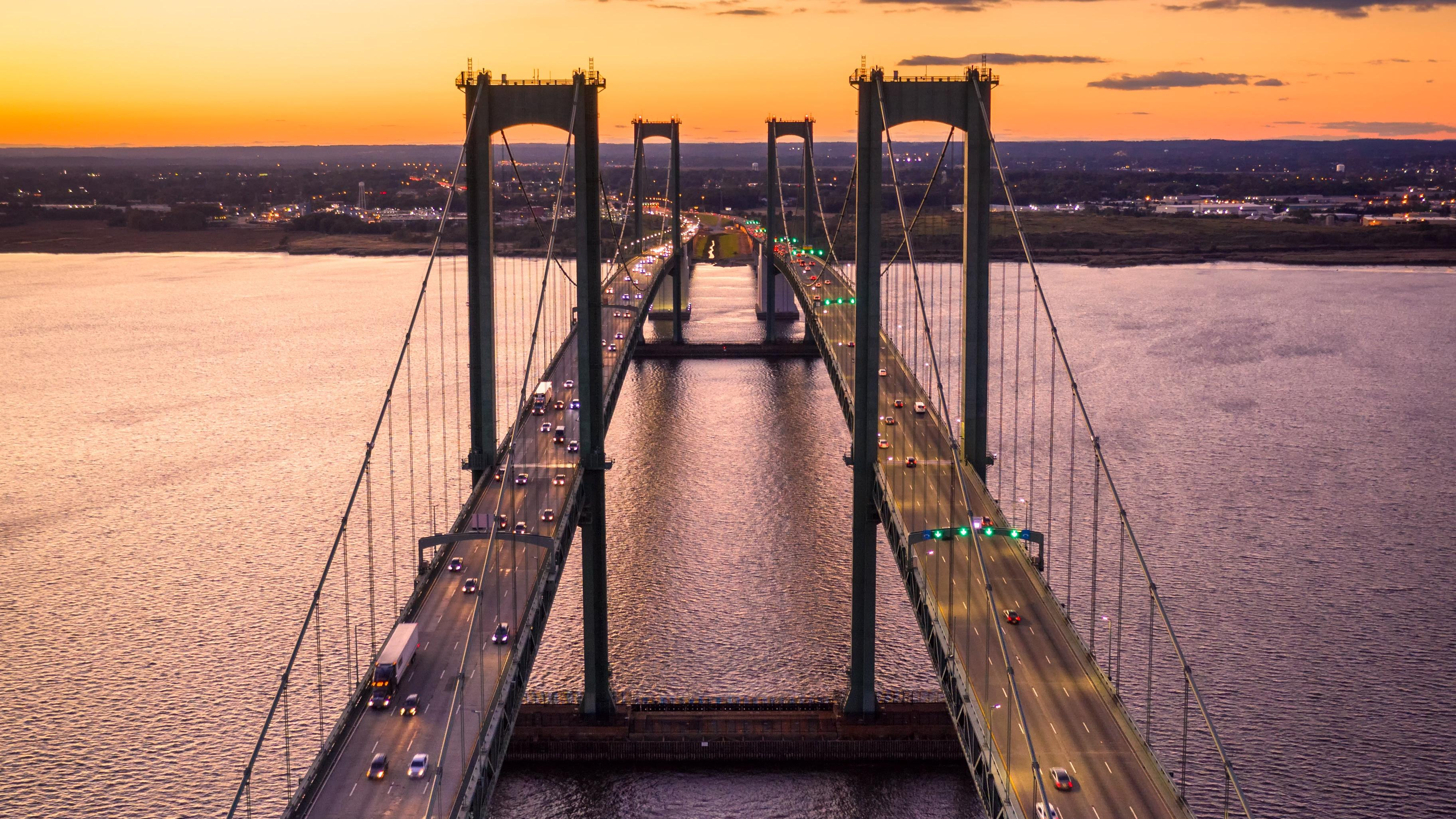 With parallel 2,150-foot main spans, the Delaware Memorial Bridge is the 9th-longest suspension bridge in the United States. The bridge links Delaware and New Jersey over the Delaware River. The first span opened in 1951, and the second span opened in 1968.