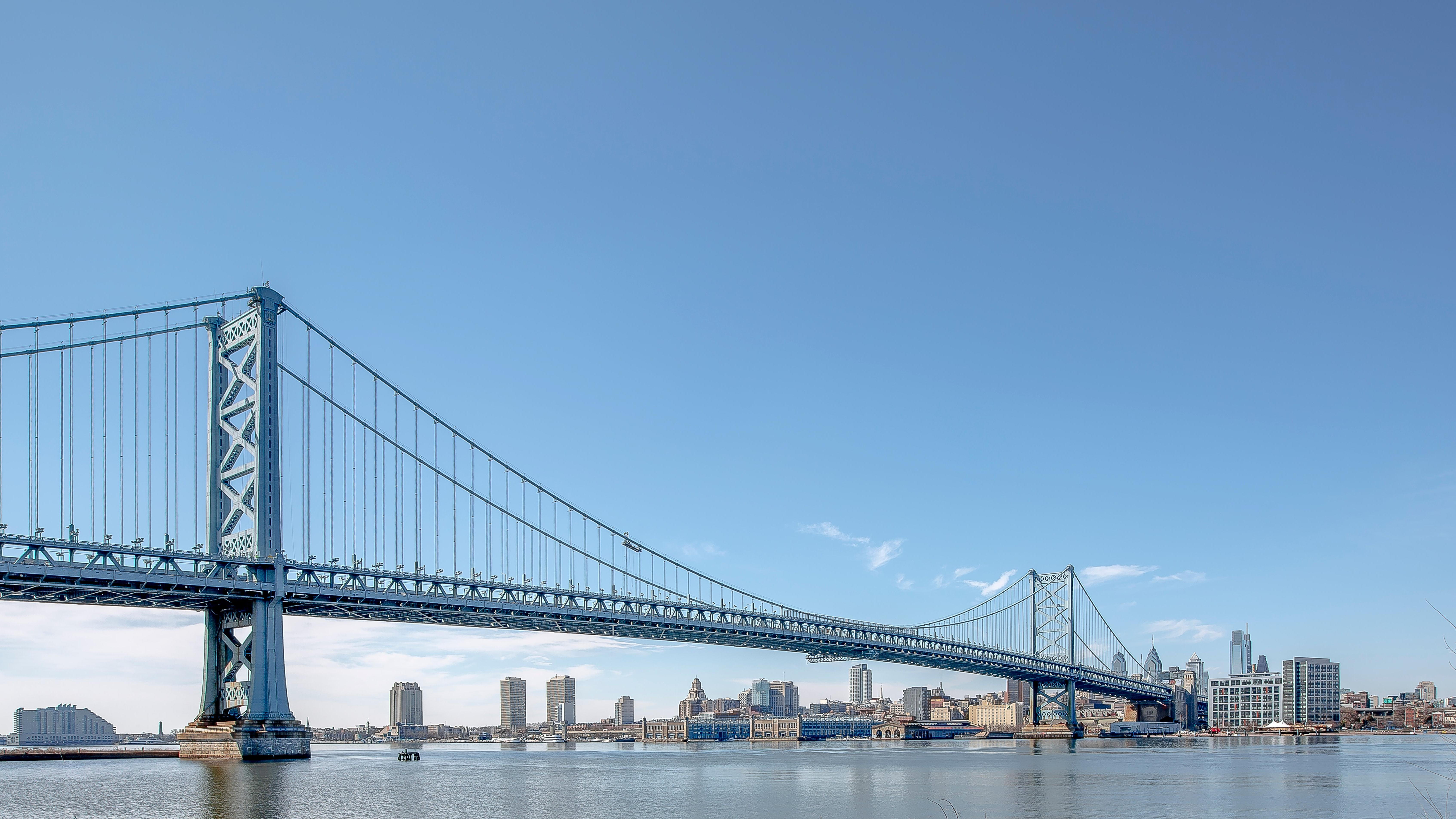 With a 2,000-foot main span, the Walt Whitman Bridge is the 10th-longest suspension bridge in the United States. The bridge crosses the Delaware River connecting Philadelphia, Pennsylvania and Gloucester City, New Jersey.