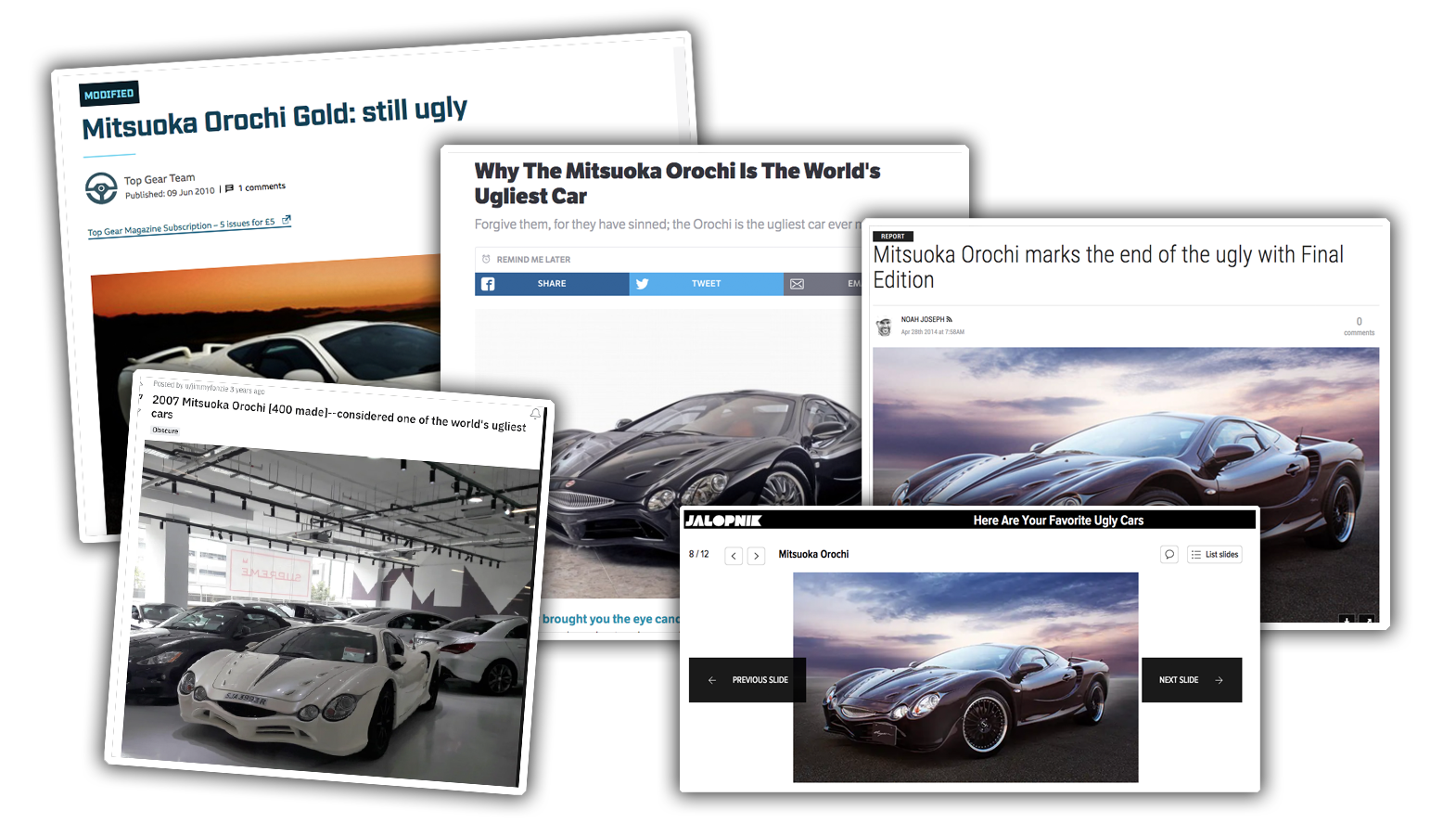 The reason I'm comparing it to a Mitsuoka Orochi is that the Orochi always seems to get singled out for being especially ugly. Just Google it and you'll see, it's everywhere: