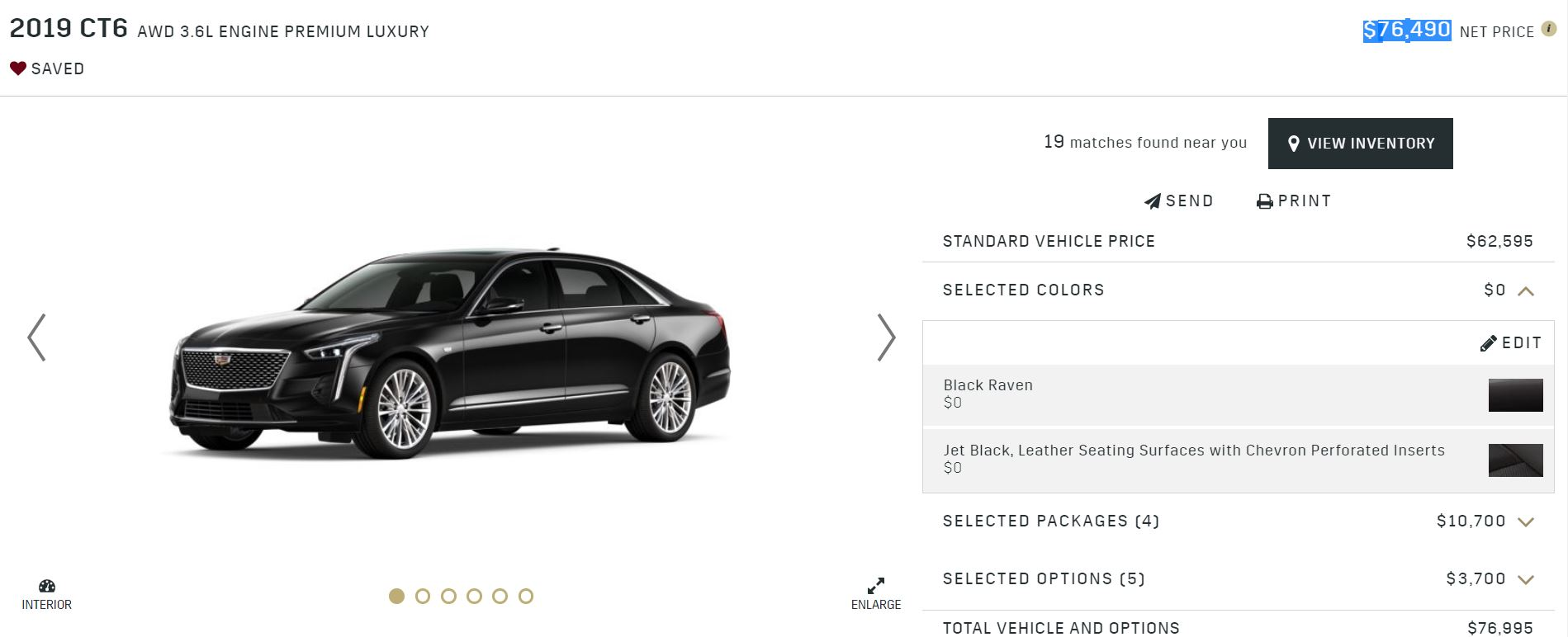 I built out a 2019 Cadillac CT6 Premium Luxury with all of those features on Cadillac's site and the final price came out to $76,490. So, there actually are some savings, despite the really fancy options.