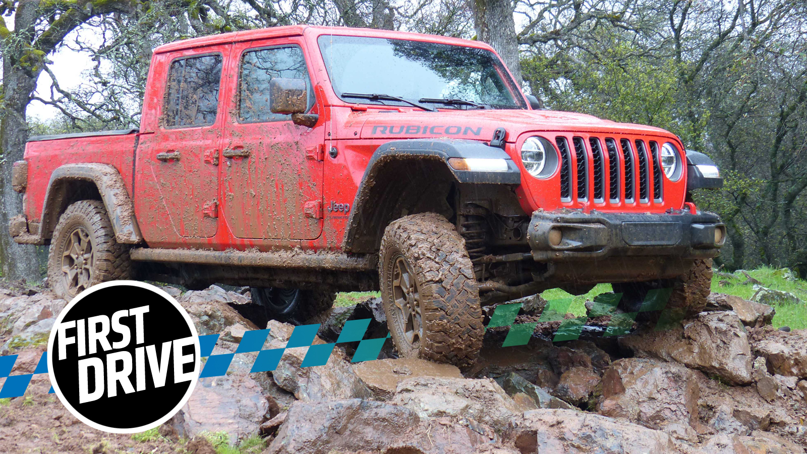 The Rubicon I drove through the trail had the optional Falken mud-terrain 33s on it, and though they slipped a bit on some of the muddy, wet rocks, they handled the job well, and play a major role of giving the truck approach, breakover, and departure angles of 43.4, 25, and 20.3, respectively, as well as a whopping 11.1 inches of ground clearance. That great geometry allowed me to navigate the convertible pickup through the admittedly rather mild course consisting of muddy trails and small rock gardens while barely scratching up the underbody skid plates.