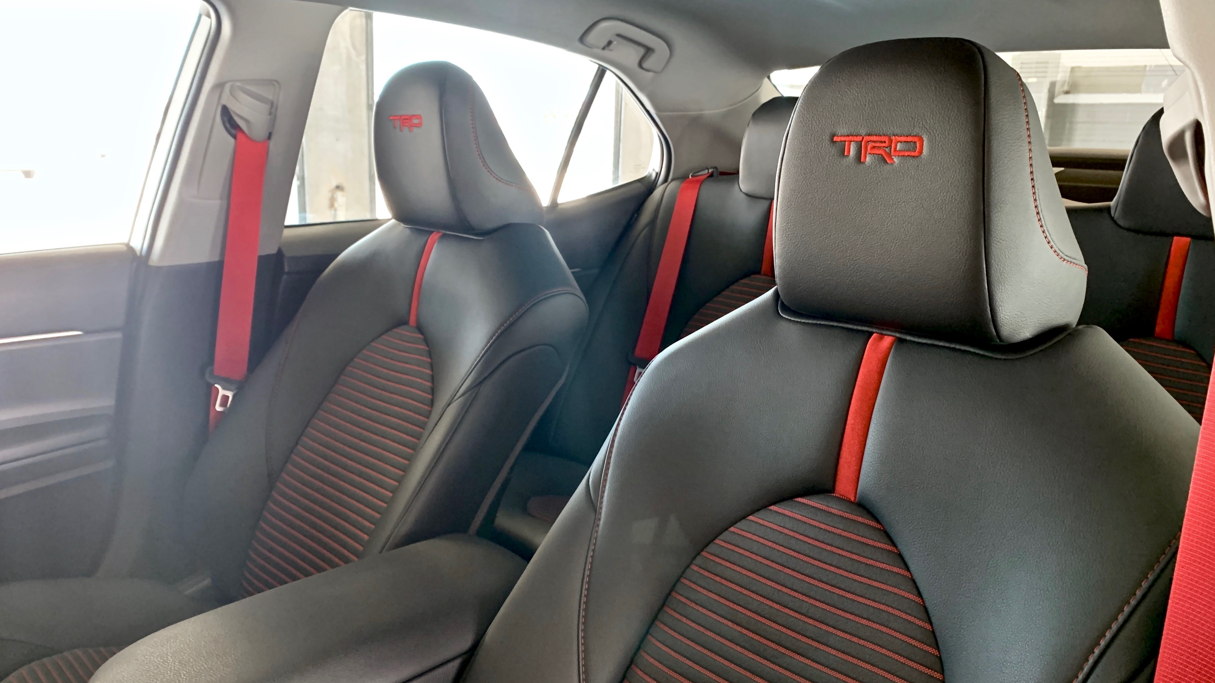 The interiors resemble each other, and the Avalon TRDs simply have more toned-down accents than the Camrys do—as if the Avalon TRD, with its smaller spoiler and all-black side mirrors incasing a bunch of red interior accents, is for the person who wants to be more discreet, while the Camry is a tad edgier.