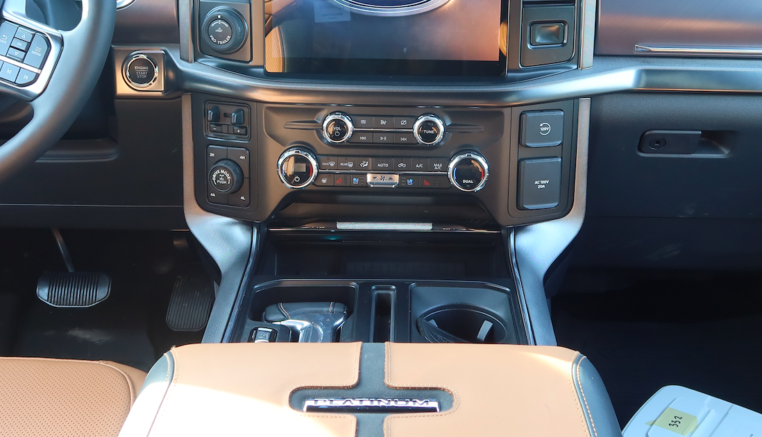 The Interior Work Surface, available on bucket-seat-equipped trucks, includes an electrically folding transmission shift lever. With that out of the way, the center armrest flips forward to create a flat table, ideal for food, a laptop, a clipboard or whatever.