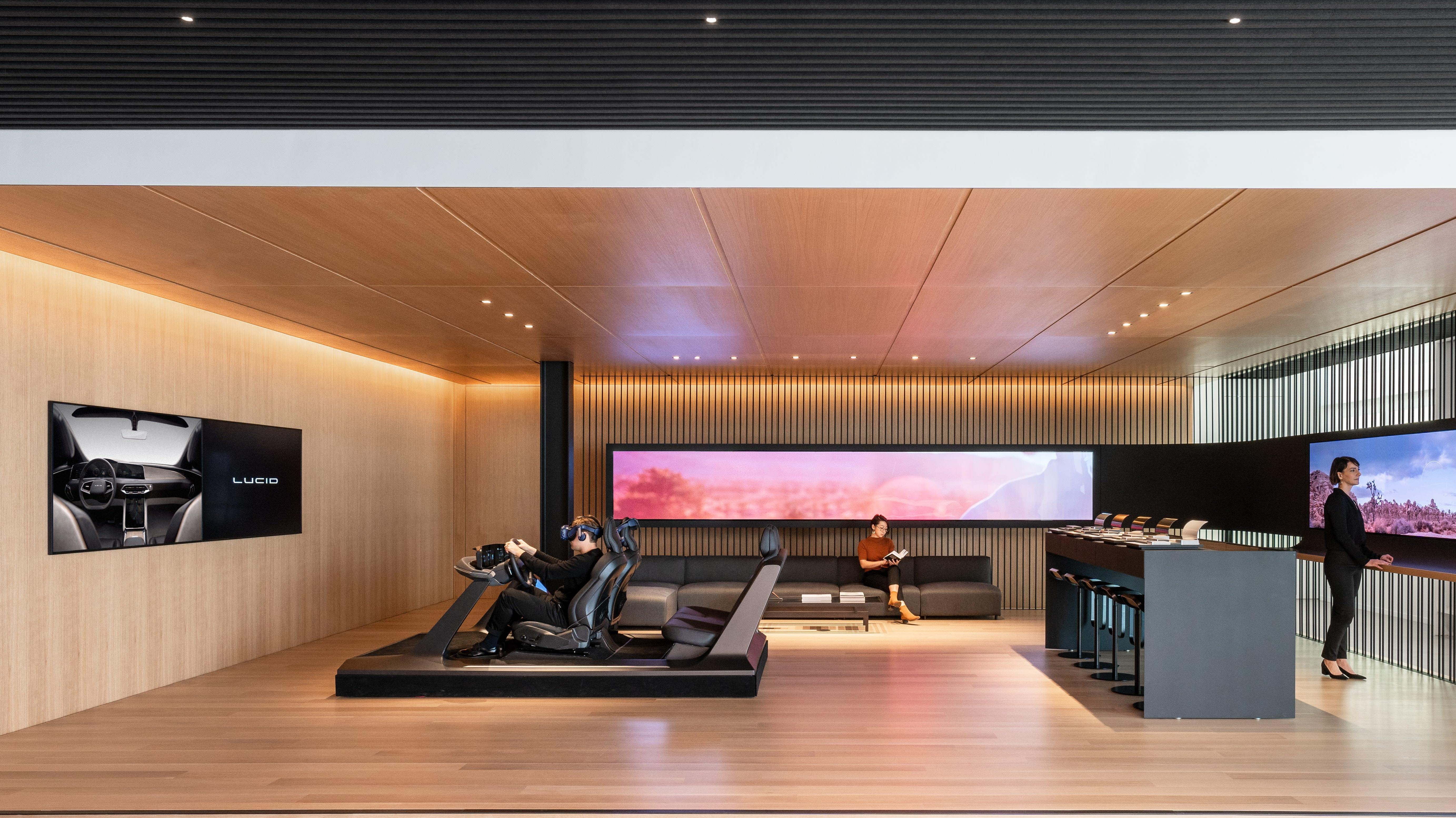 A full array of Air seats and a disembodied dashboard protrude from the floor of the showroom, allowing potential customers to put on a VR headset to experience the inside and outside of the options and colors they've chosen. This can help someone pick between the Santa Cruz Sunrise interior and the Mojave at Midnight interior. Lucid has developed its interiors based on different locations in California at specific points in time. They're mostly the traditional variants you'd expect in taupes and browns and tans and blacks, but Lucid's interiors team wanted to "construct their own brand story" with this Cali connection.