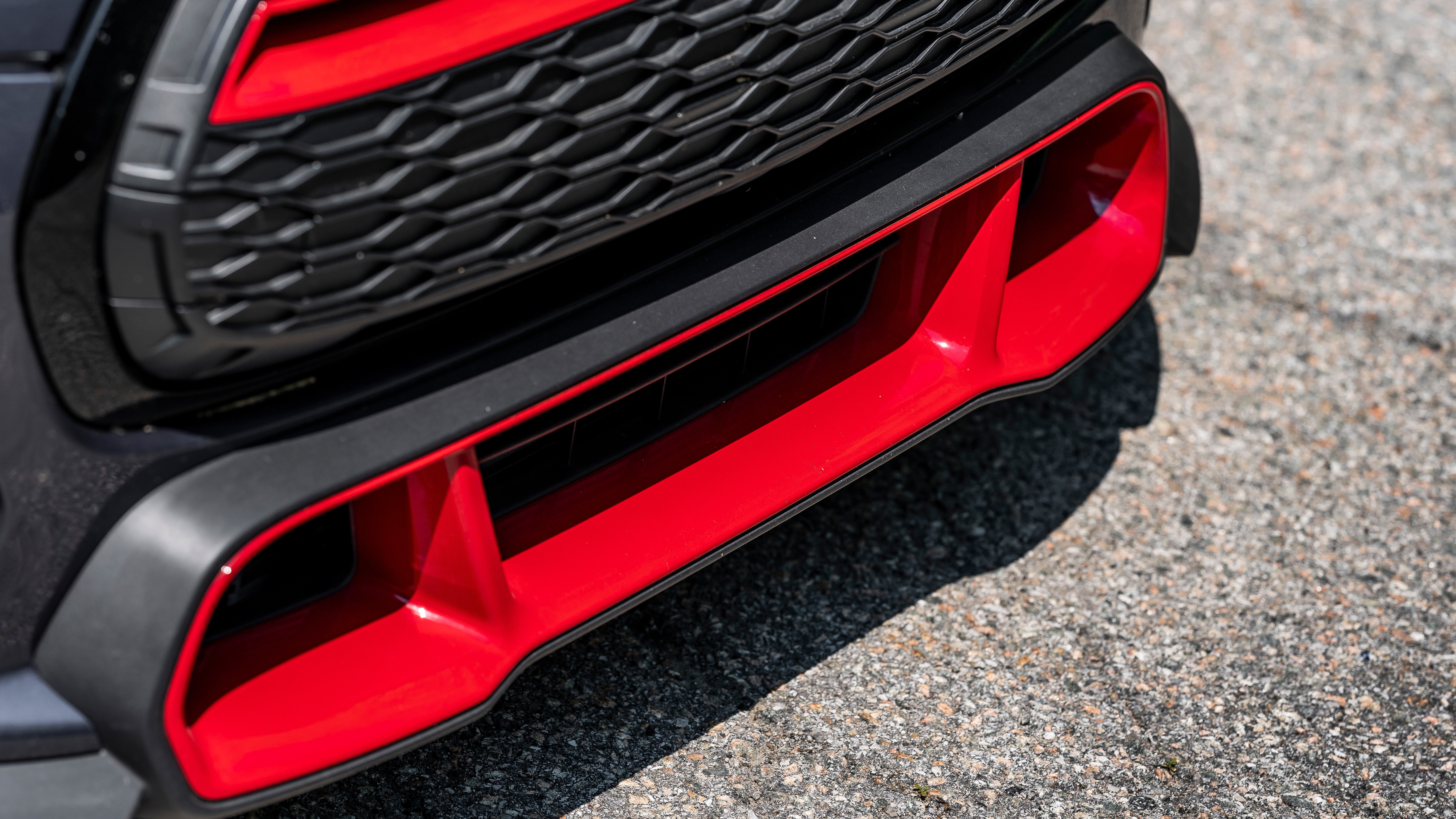 The GP is a beehive of fun and looks the business. There is a giant, bright red aluminum brace cutting through where the rear seats used to be. Its fenders? Square-flared. Aero? Visibly too much, maybe, but with cool effect.