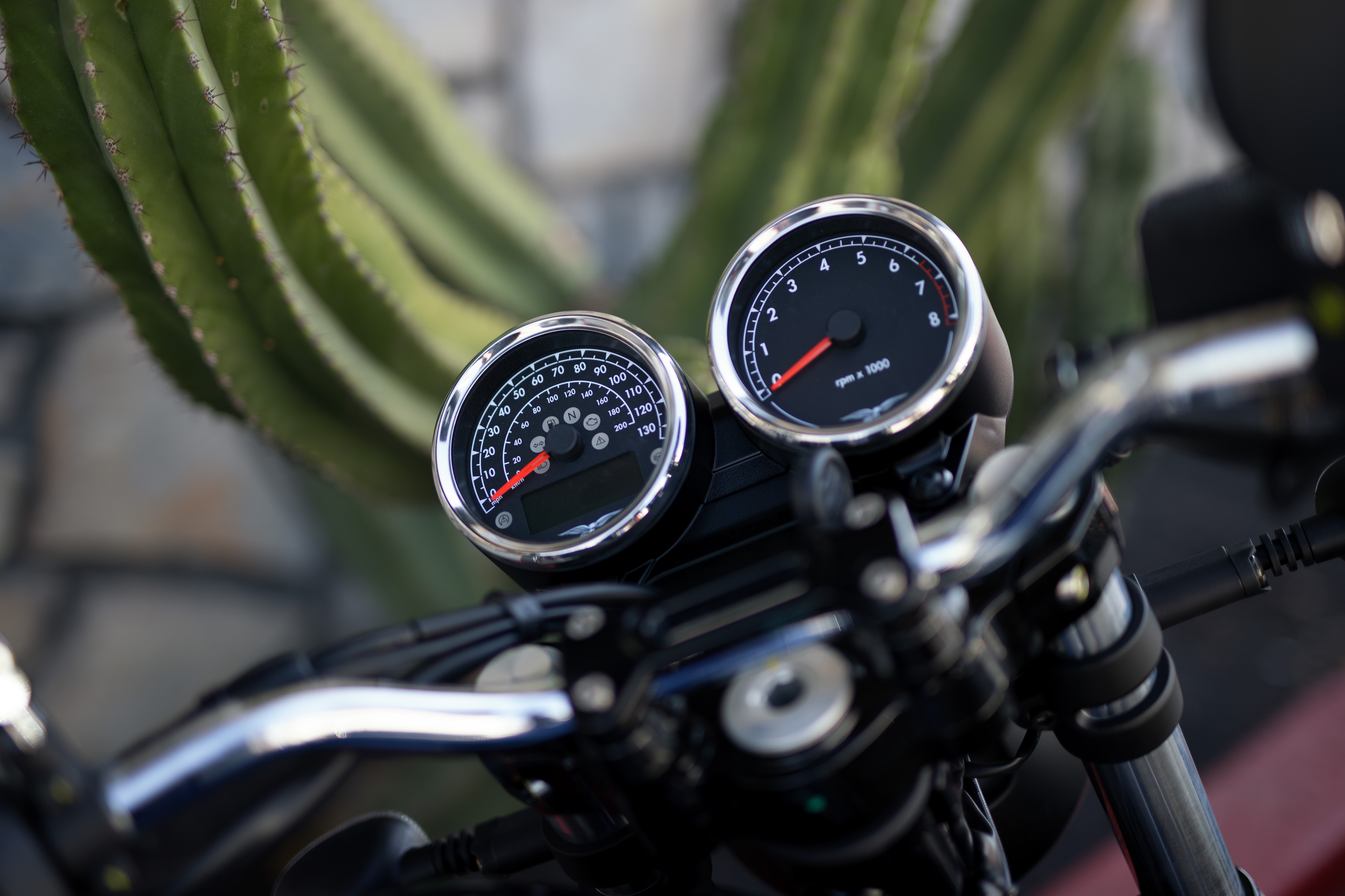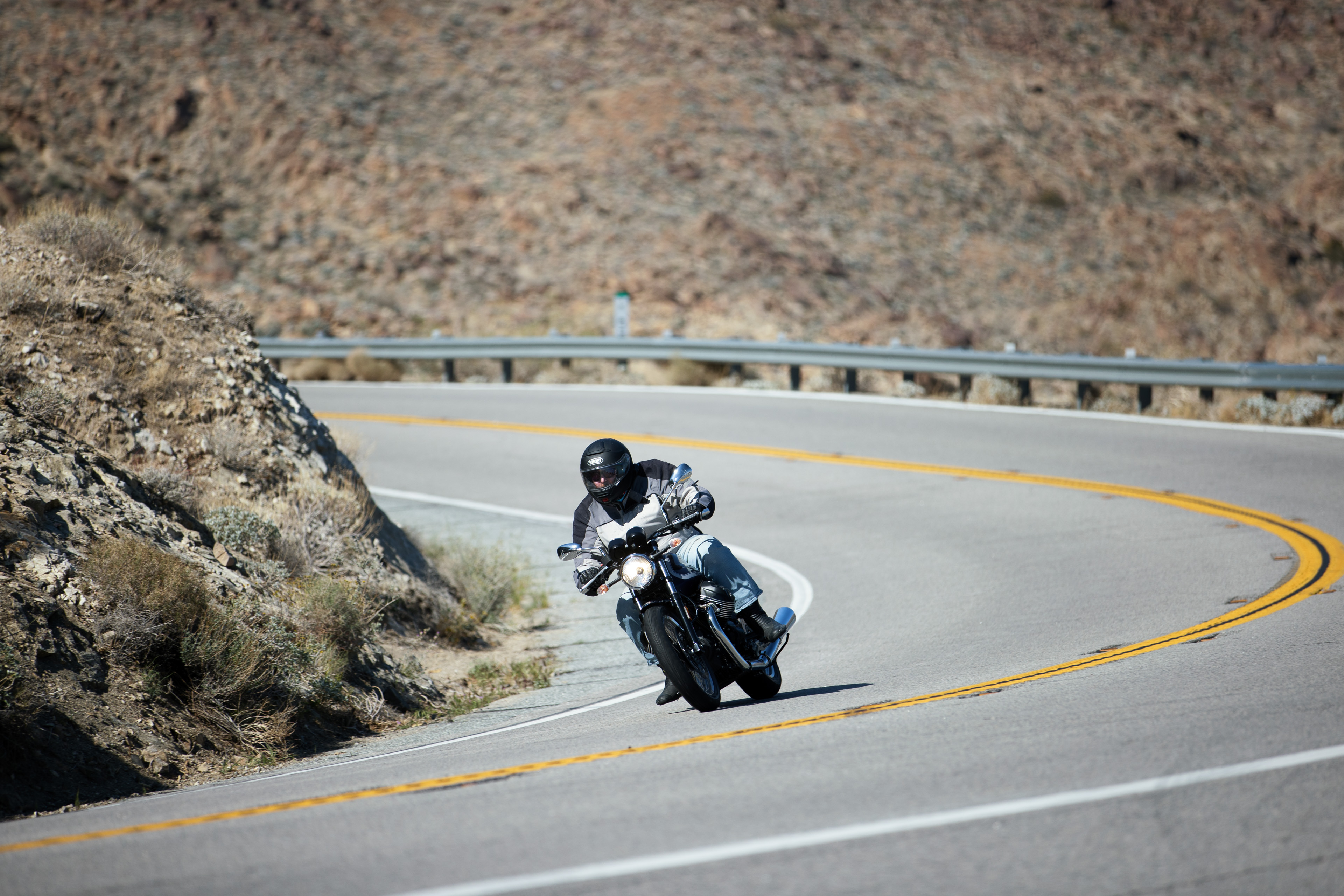 With a gentle but deliberate nudge of the starter button the engine fires up, the torque reaction thumping the bike over to the right. At idle, the two cylinders bap-bap-bap away, seemingly independently, begging for more revs and speed. The brown leather seat, deep blue bodywork, twin gauges, dual chrome pipes and wire wheels all contribute to a gorgeous throwback bike. I could have convinced myself that this was the 1960s — until I was passed by a Palm Springs Special (a certified pre-owned Bentley Continental GTC).
